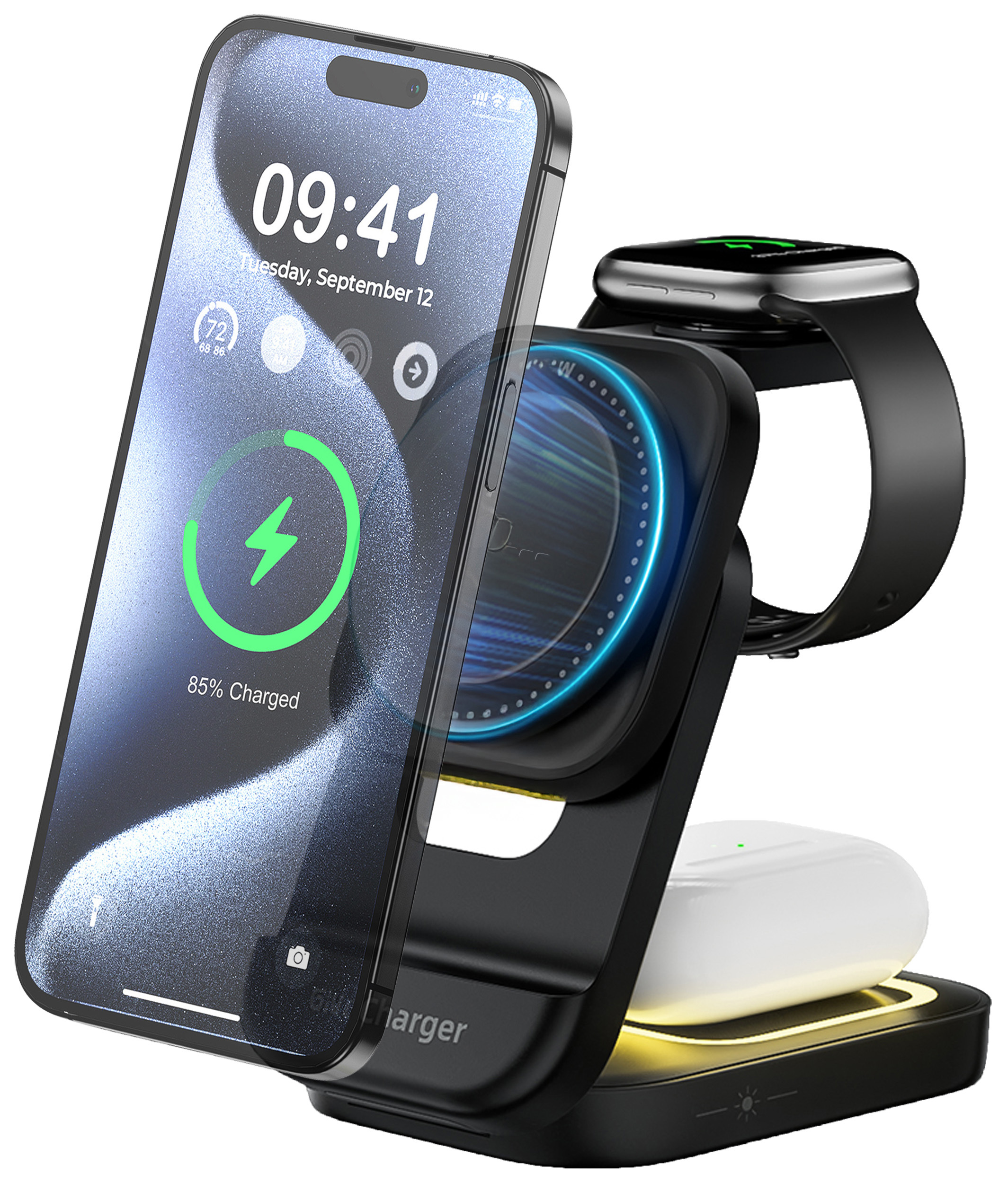 Dank MagSafe-kompatibler Magnetfläche platziert man das iPhone ganz einfach an der richtigen Stelle. Es haftet sicher und startet automatisch den Ladevorgang. Auch die Apple Watch und die AirPods finden intuitiv ihre Position - für bequemes und effizientes Laden ohne Nachjustieren.