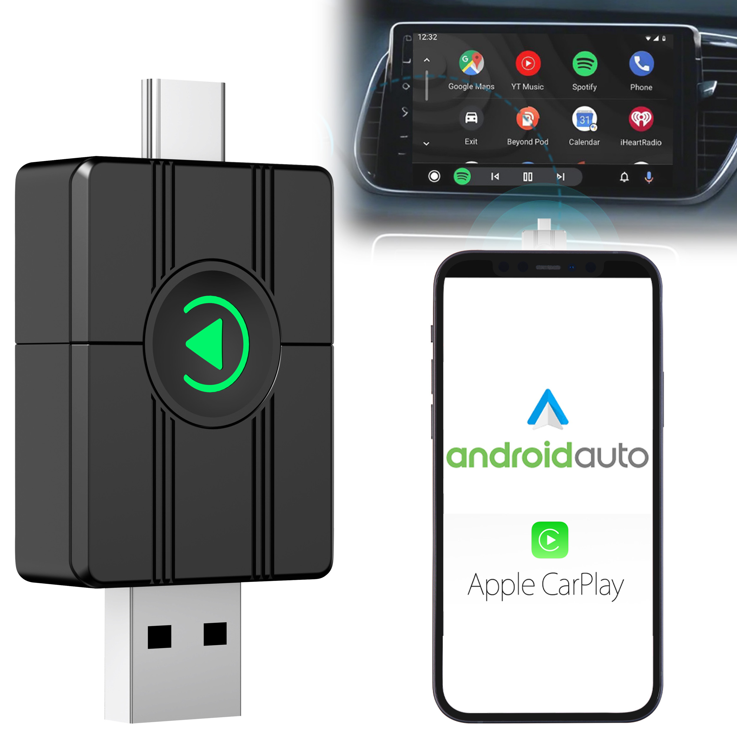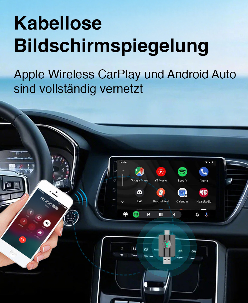 Schluss mit Kabelsalat im Auto: Der kompakte Adapter von Creasono bringt Apple CarPlay und Android Auto kabellos aufs Display – egal welches Smartphone gerade dabei ist. Musik, Navigation und Sprachsteuerung laufen einfach, ohne ständig Kabel umzustecken.