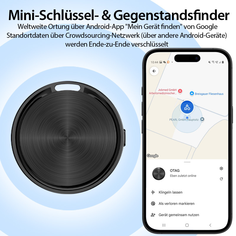 Ortung für Schlüssel, Taschen und Geldbörsen: Der Mini-Tracker von Callstel lässt sich jederzeit über Android-Smartphones und -Tablets aufspüren. Andere Android-Geräte in der Nähe können verschlüsselte Standortsignale weiterleiten – selbst wenn der Tracker offline ist. Die Standortdaten werden Ende-zu-Ende verschlüsselt und lassen sich ausschließlich über das eigene Mobilgerät entschlüsseln.
