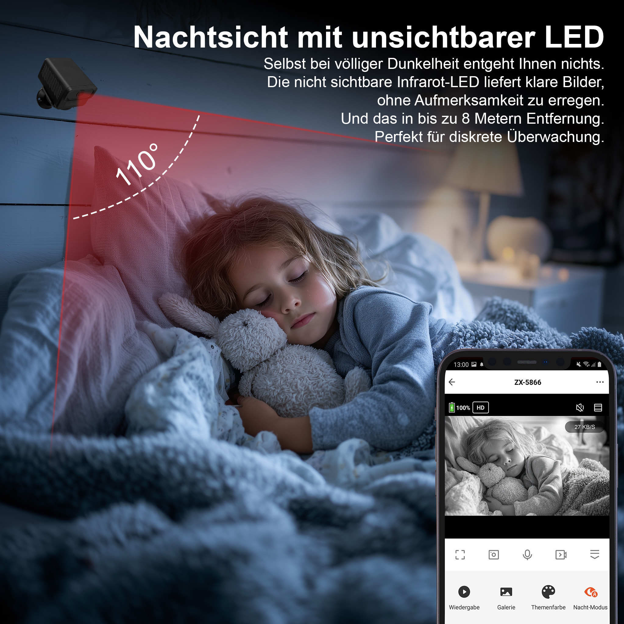 Nachtsicht mit unsichtbarer LED: Auch bei völliger Dunkelheit liefert die Kamera klare Bilder. Die nicht sichtbare Infrarot-LED arbeitet unauffällig und erreicht eine Reichweite von bis zu acht Metern – ideal für diskrete Überwachungsszenarien.