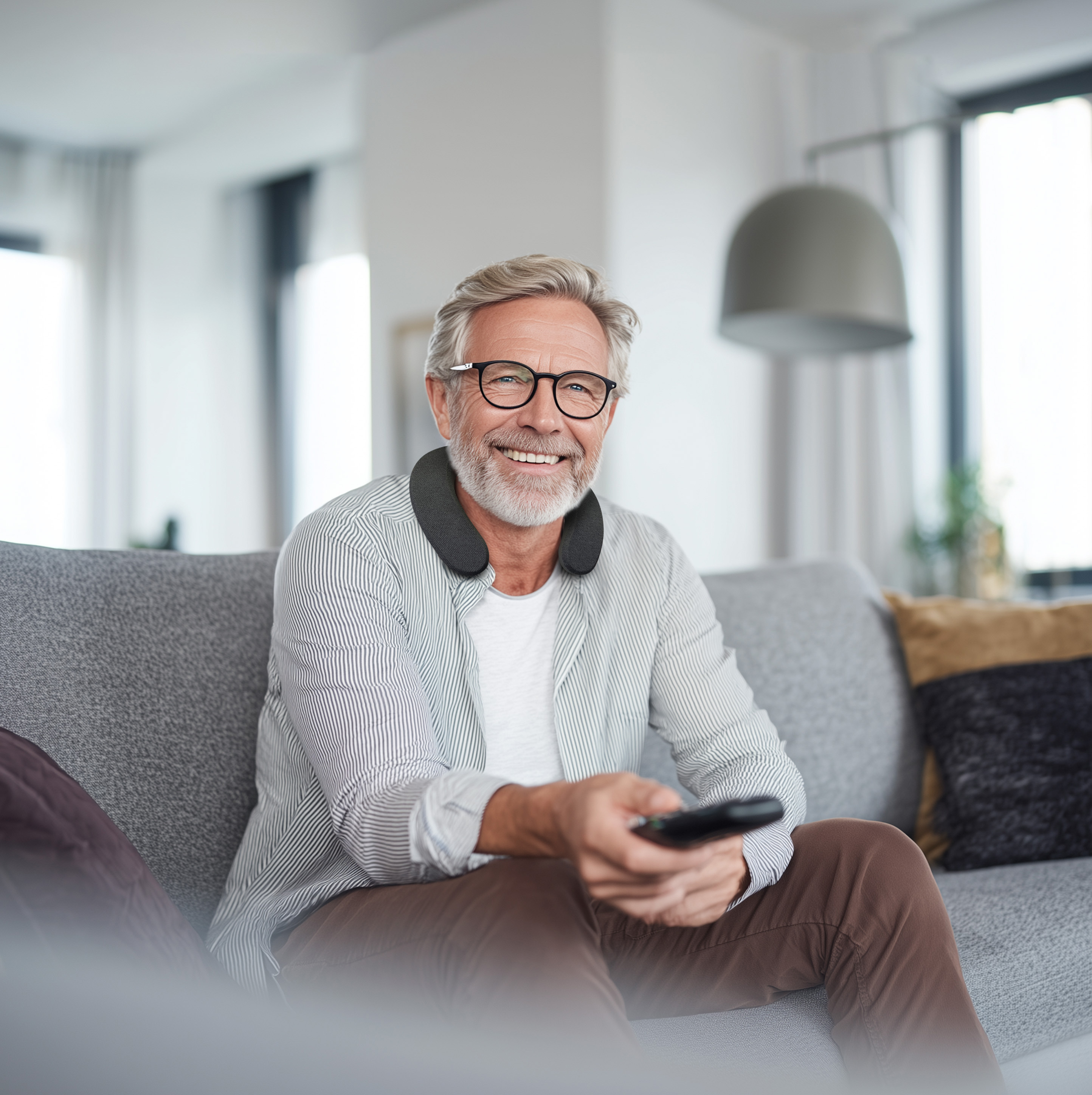 Kabellose Bewegungsfreiheit: Die Funkverbindung zwischen Nackenlautsprecher und Basisstation ermöglicht eine Reichweite von bis zu 10 Metern. Raumwechsel innerhalb der Wohnung beeinträchtigen die Klangqualität nicht. Kabel entfallen vollständig.