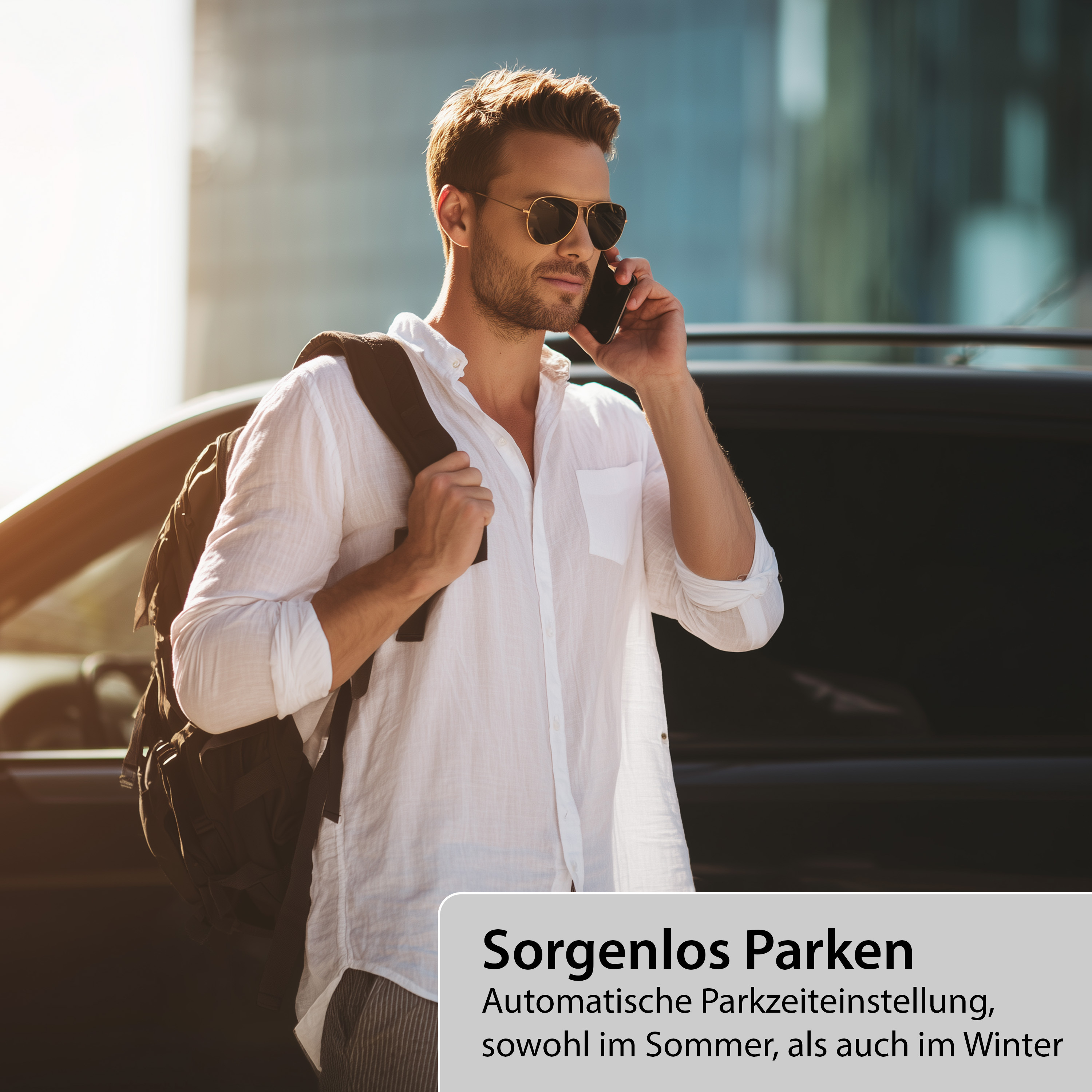 Automatische Zeitumstellung:Die Parkscheibe wechselt selbstständig zwischen Sommer- und Winterzeit und zeigt ganzjährig die korrekte Uhrzeit an. Diese Funktion lässt sich bei Bedarf deaktivieren.