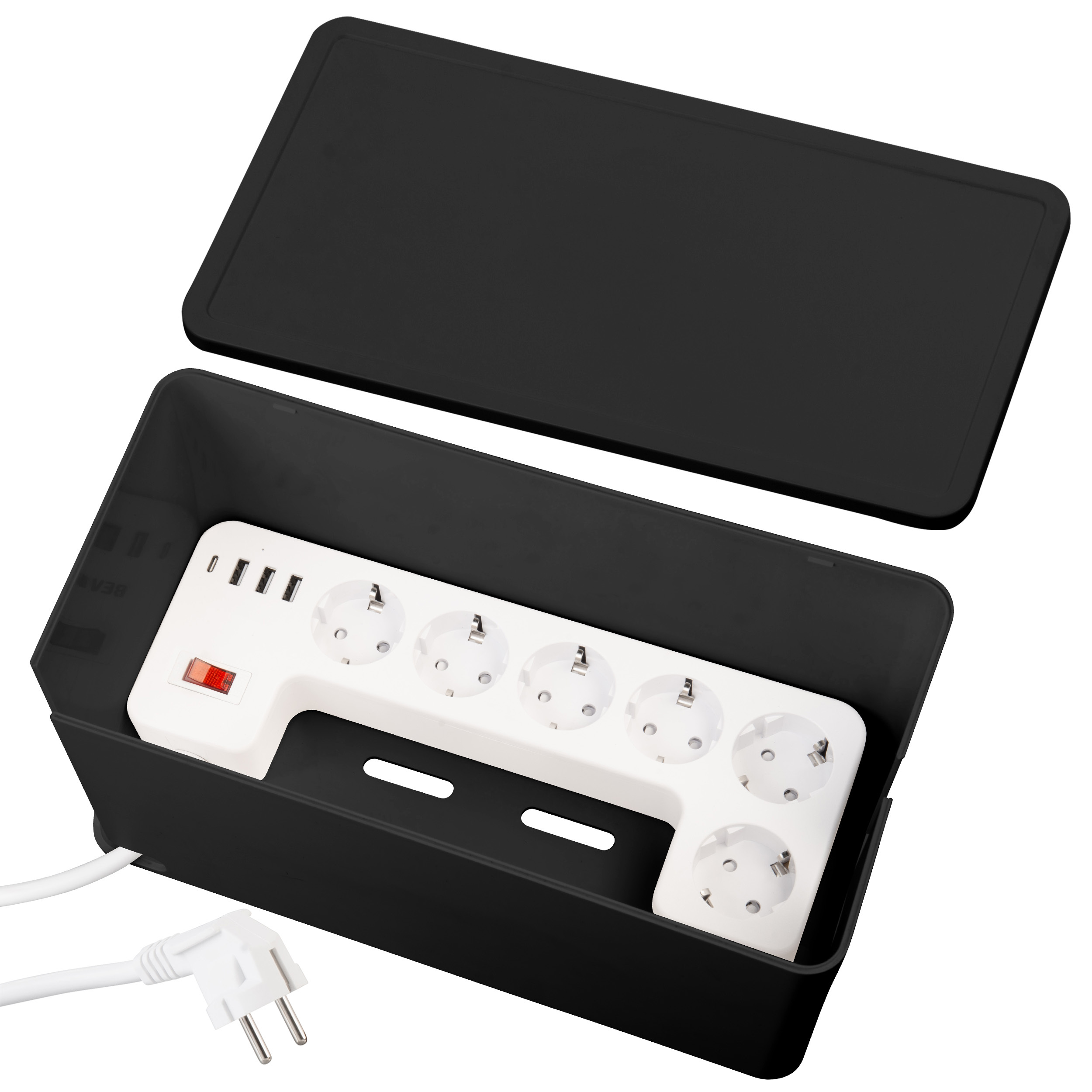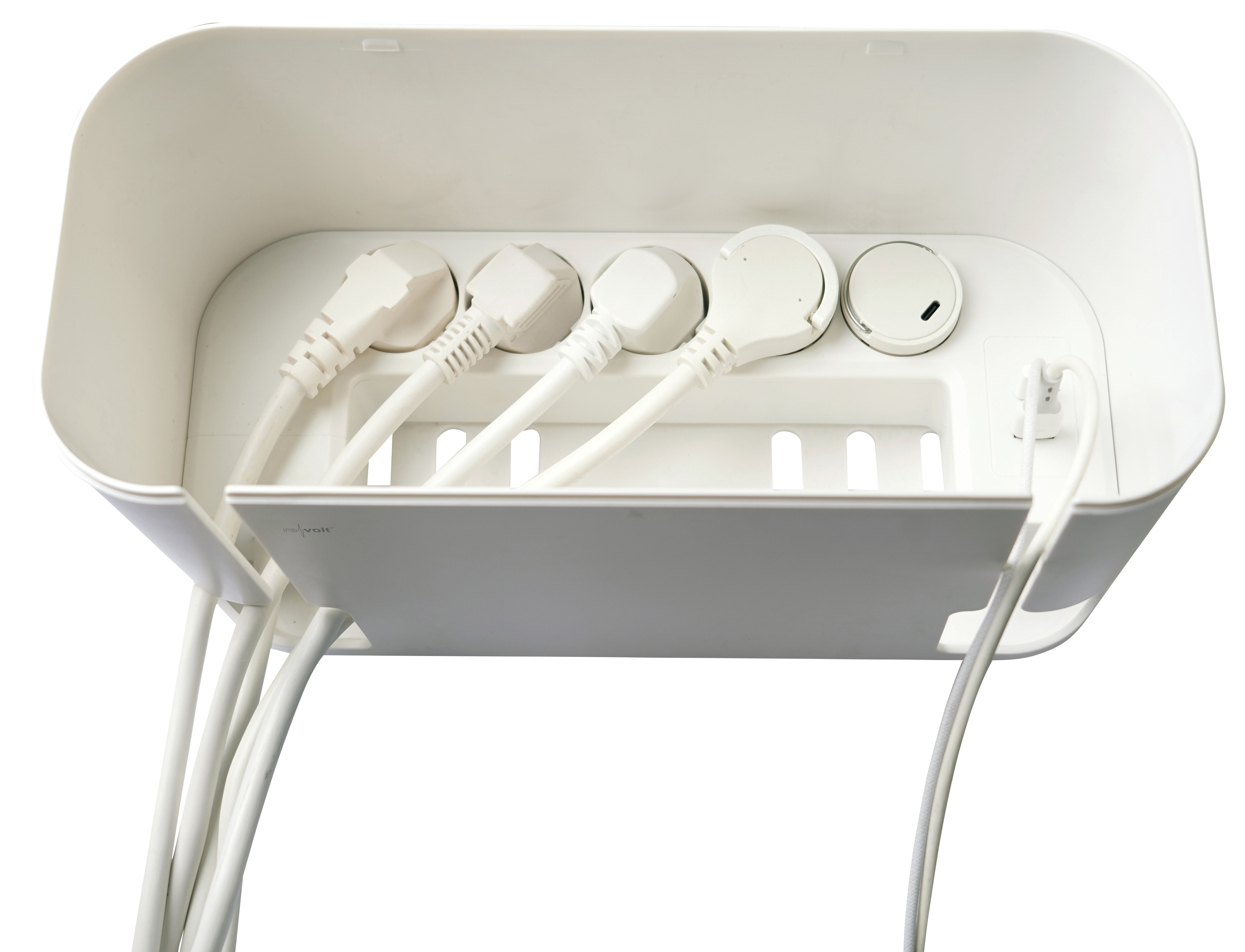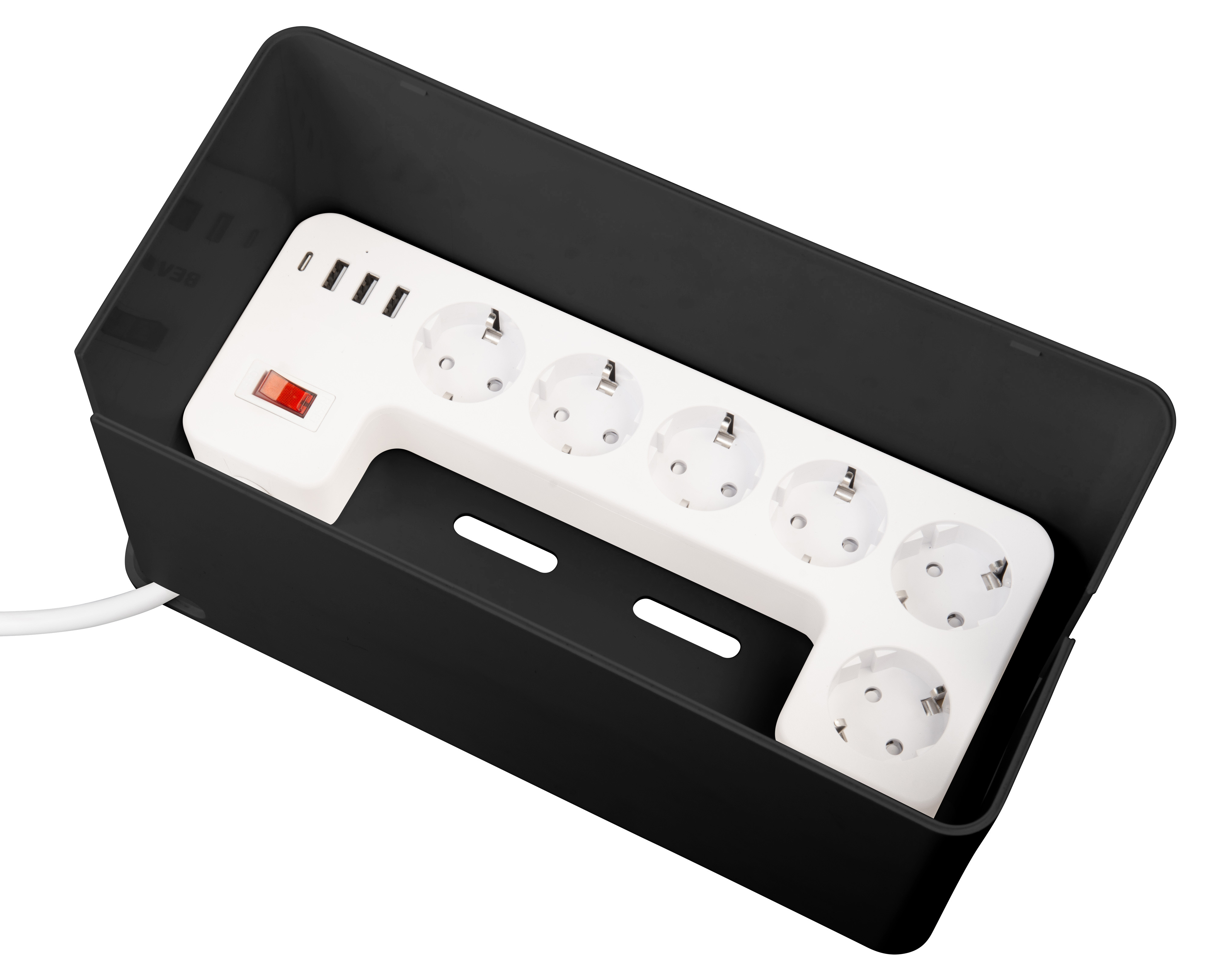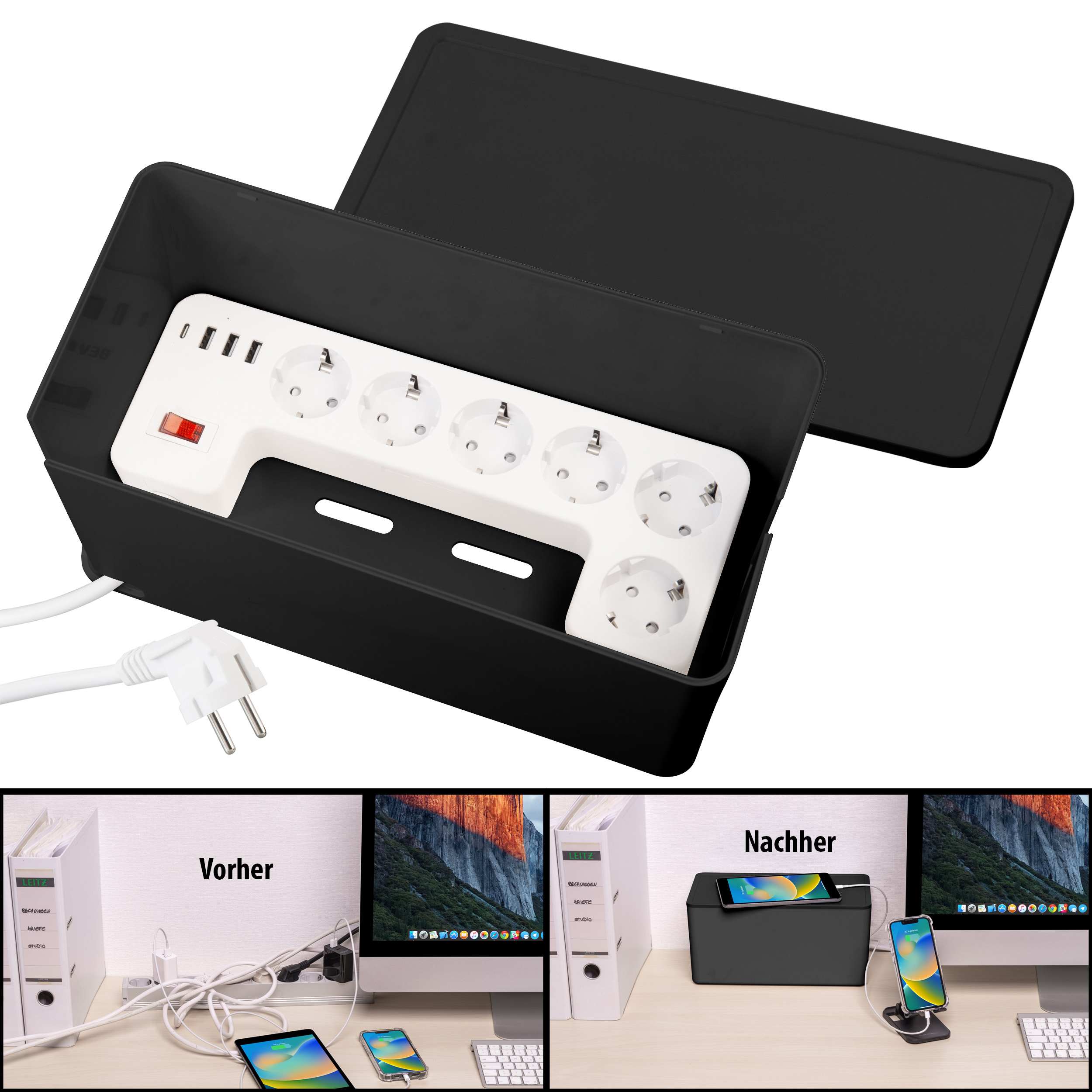 Staubschutz durch geschlossene Kabelbox: Die Steckdosen befinden sich in einer Kabelbox, die Steckplätze und Steckerverbindungen vor Staub schützt und das Kabelchaos beendet.