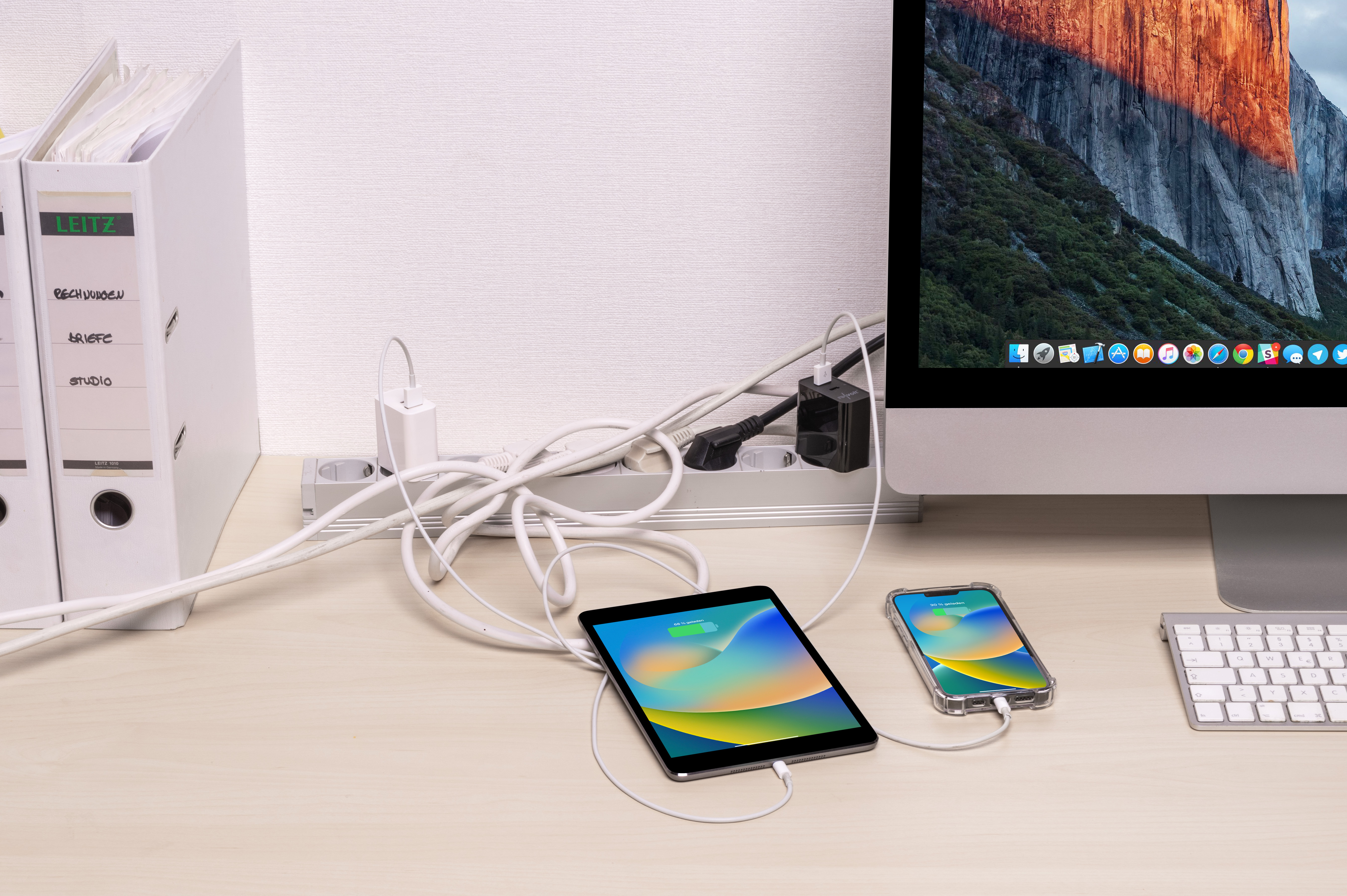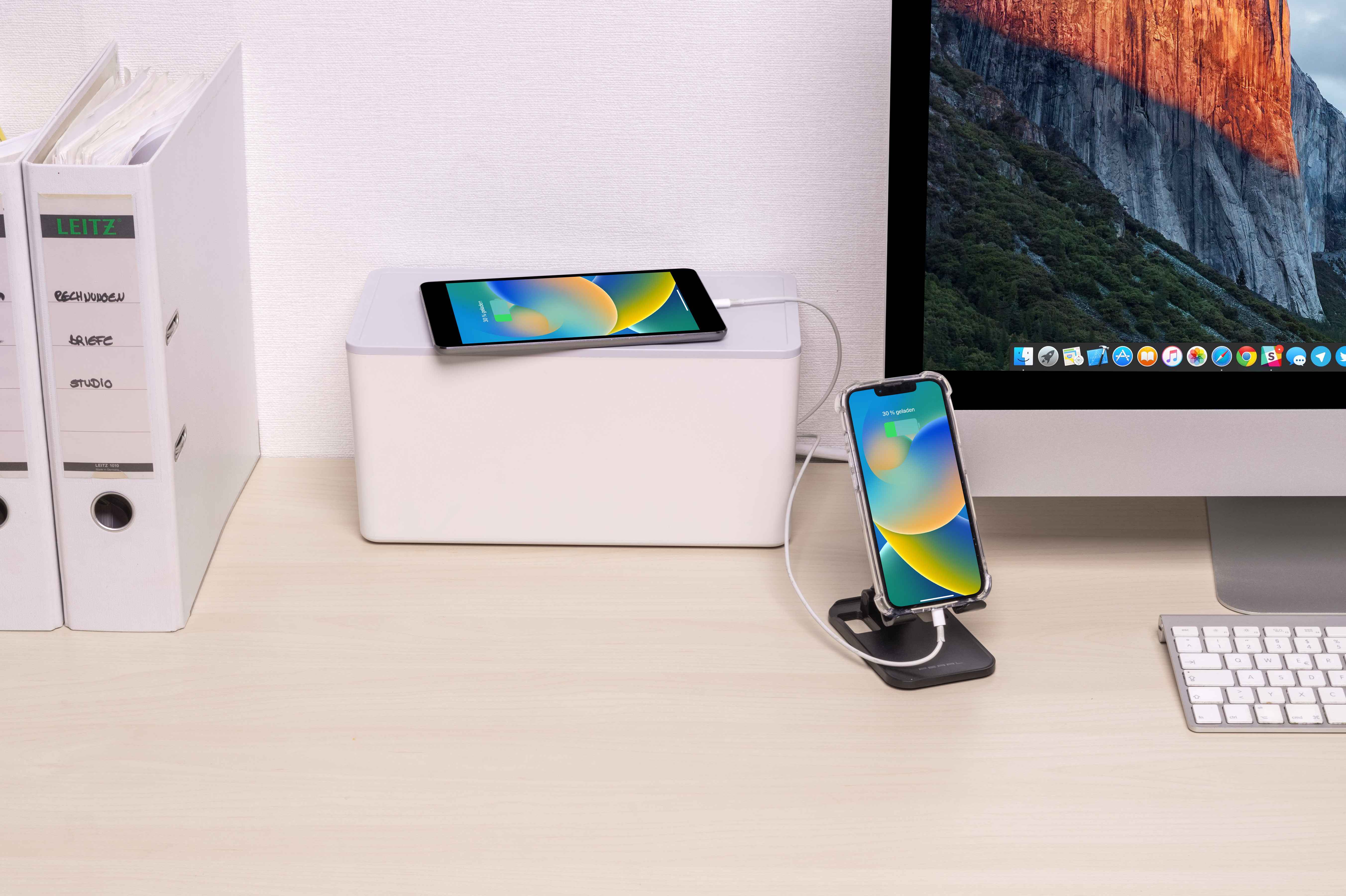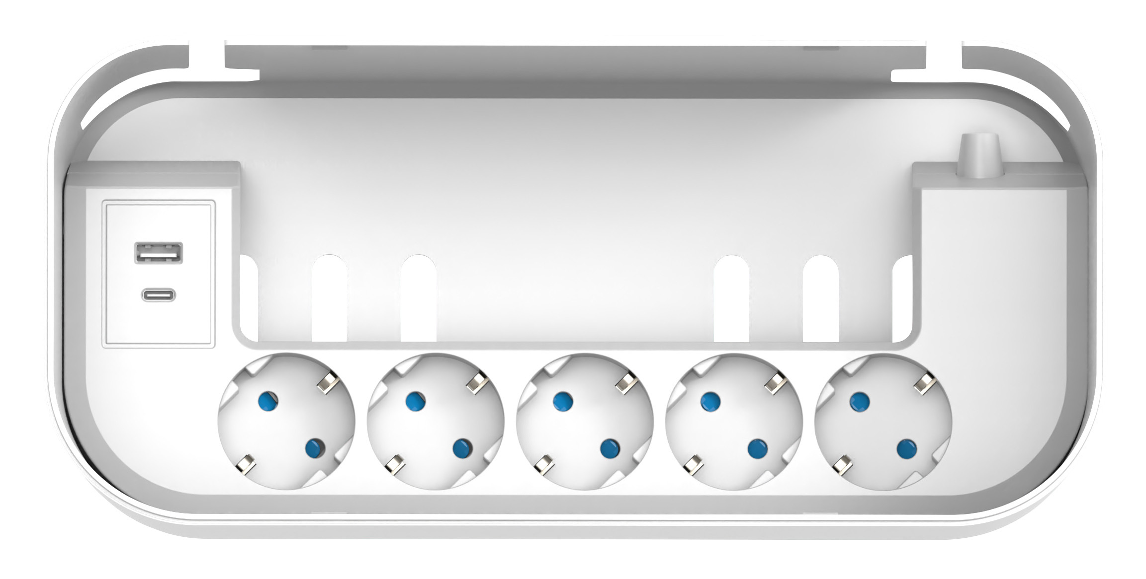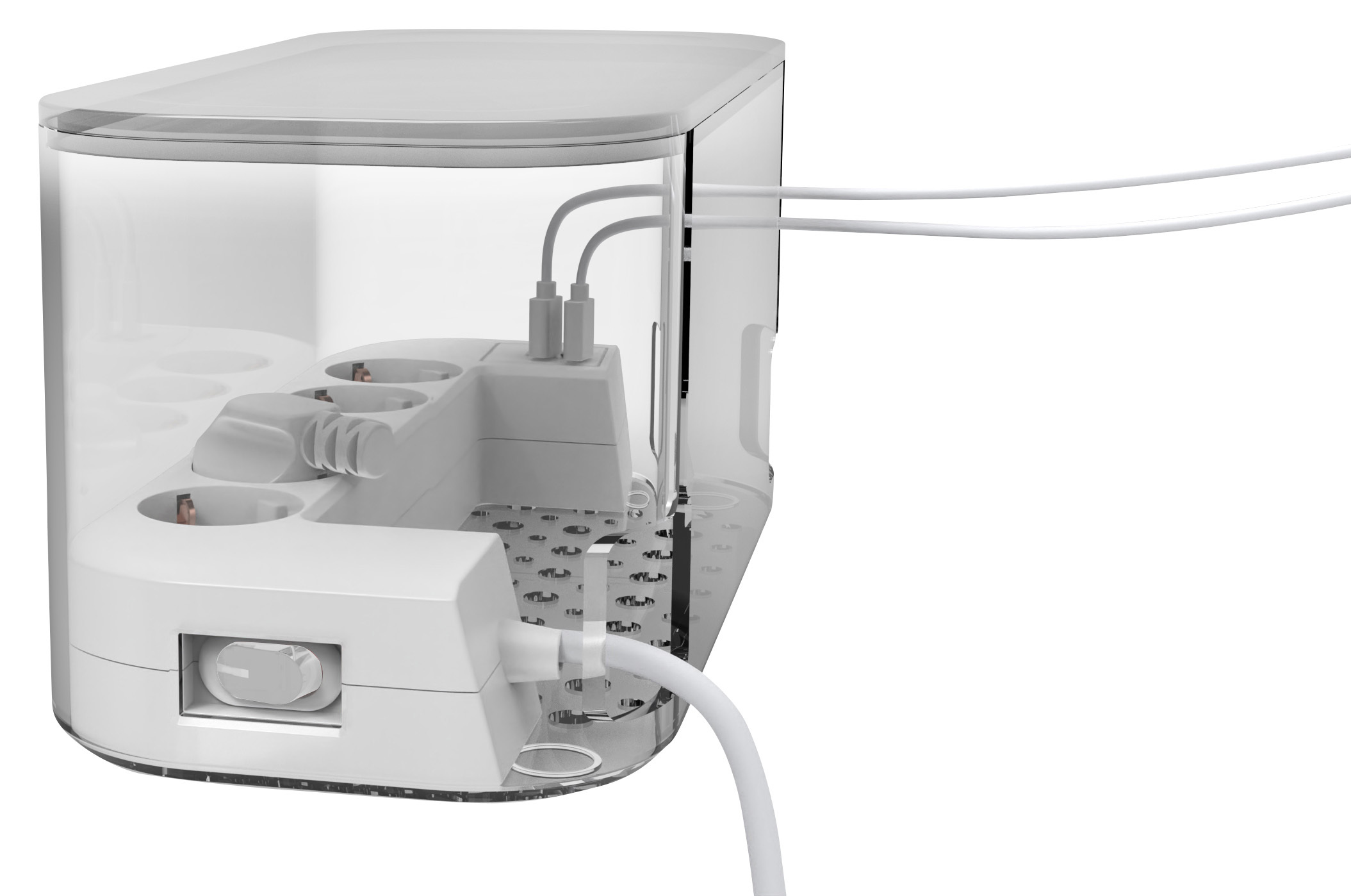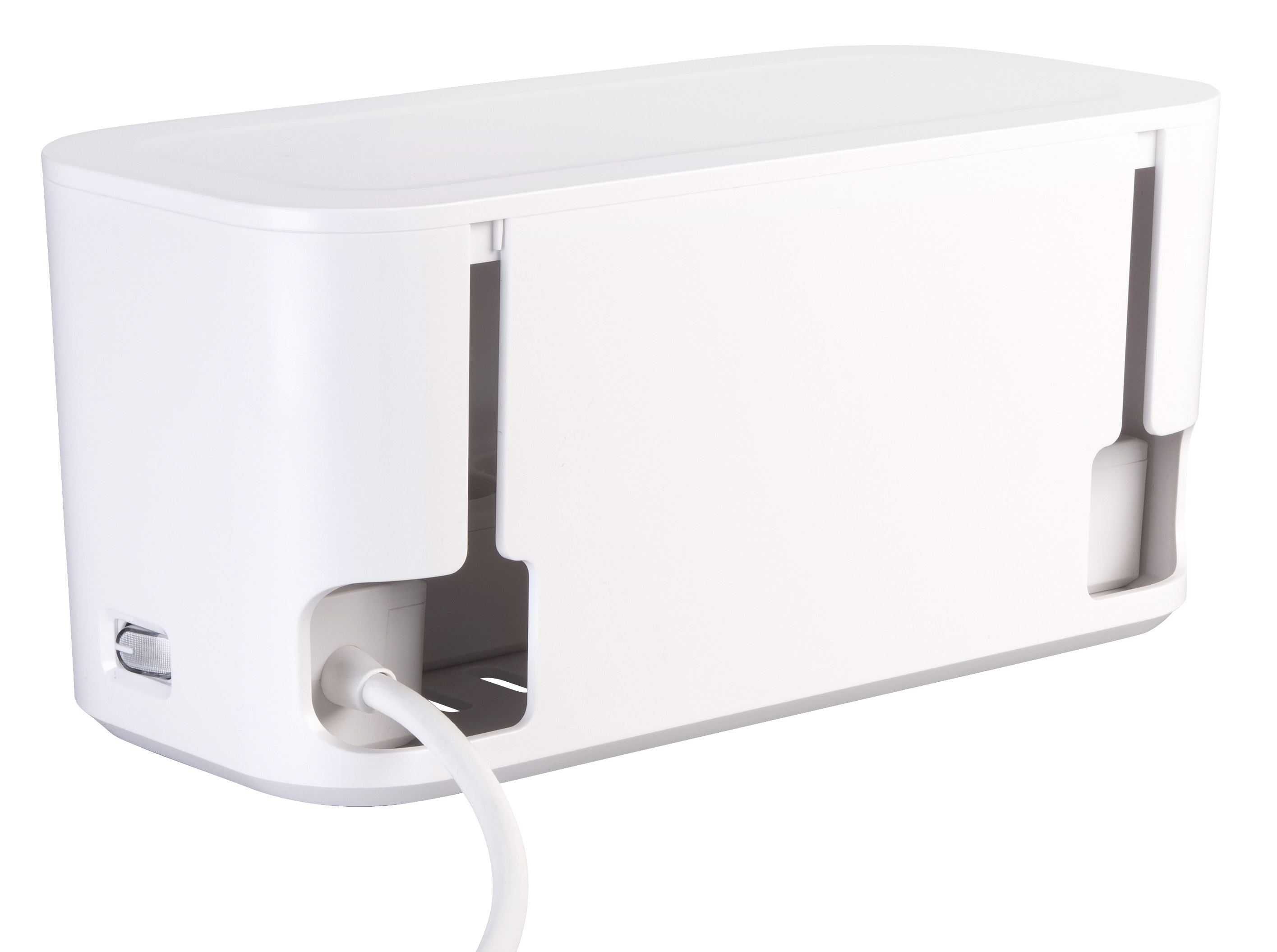 Staubschutz durch geschlossene Kabelbox: Die Steckdosen befinden sich in einer Kabelbox, die Steckplätze und Steckerverbindungen vor Staub schützt und das Kabelchaos beendet.