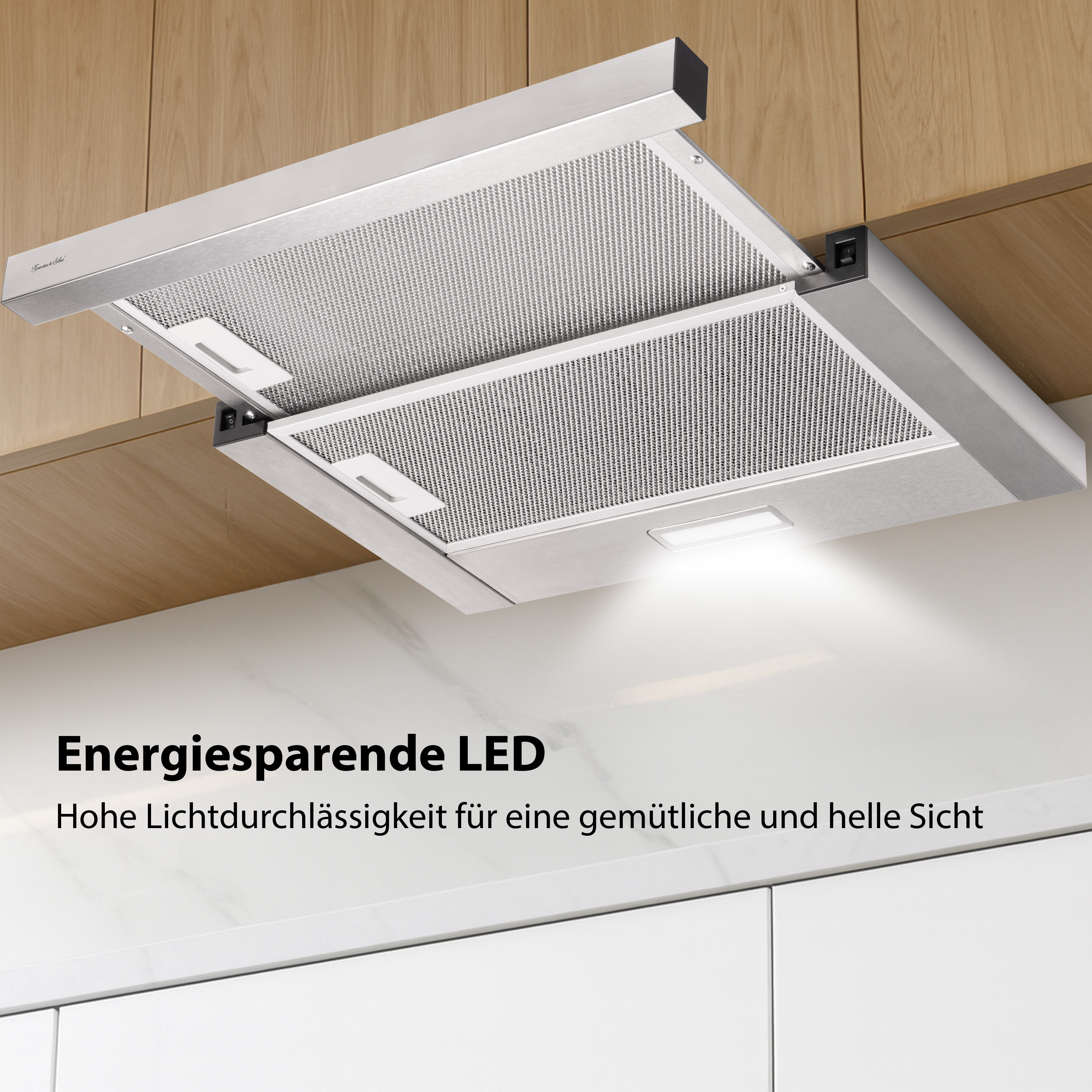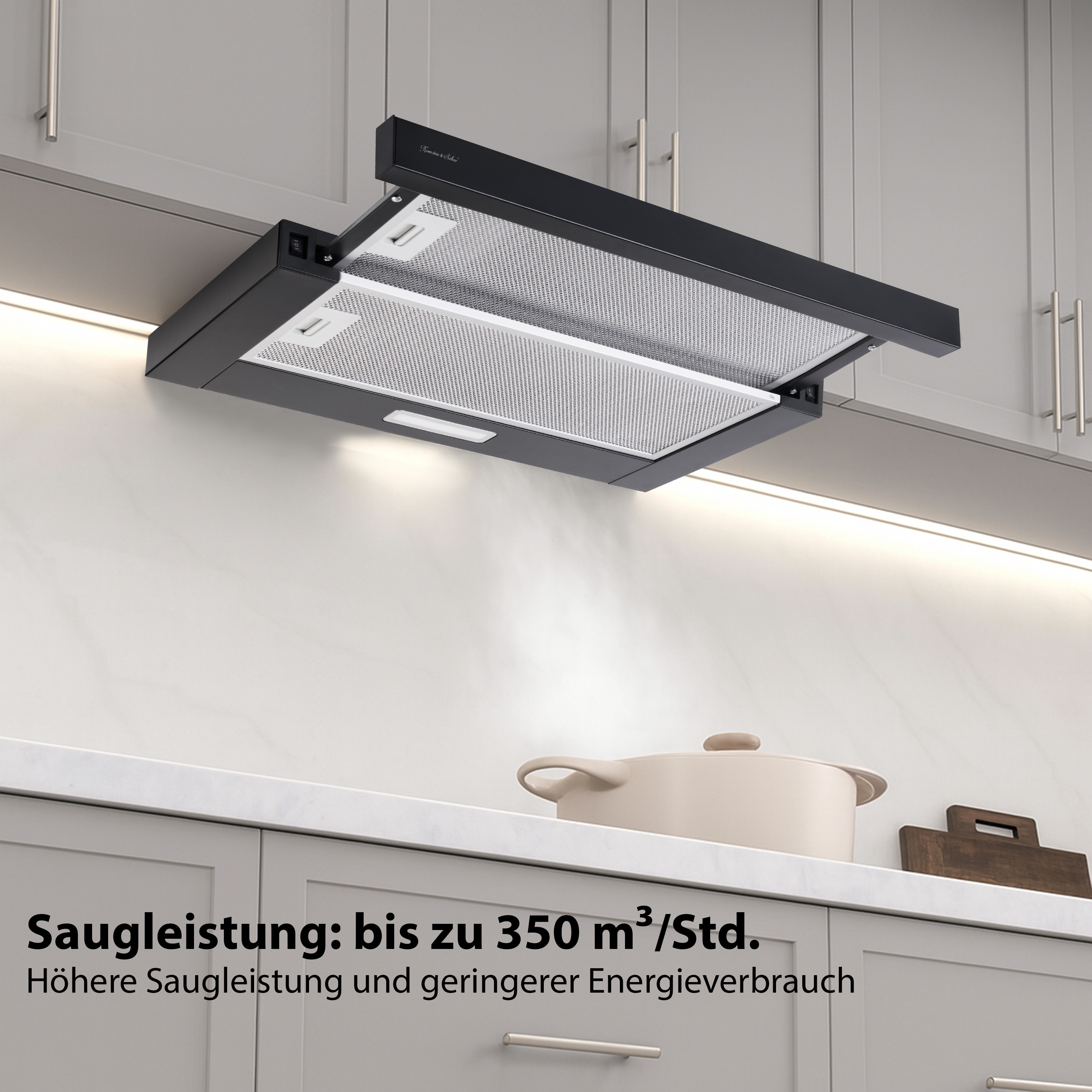 Saugleistung bis 350 m³/h mit zwei Saugstufen:Die Flachschirm-Dunstabzugshaube von Rosenstein & Söhne erreicht eine maximale Saugleistung von 350 m³ pro Stunde und entfernt Kochdämpfe sowie Gerüche. Zwei Saugstufen ermöglichen die Anpassung der Leistung an unterschiedliche Kochvorgänge.
