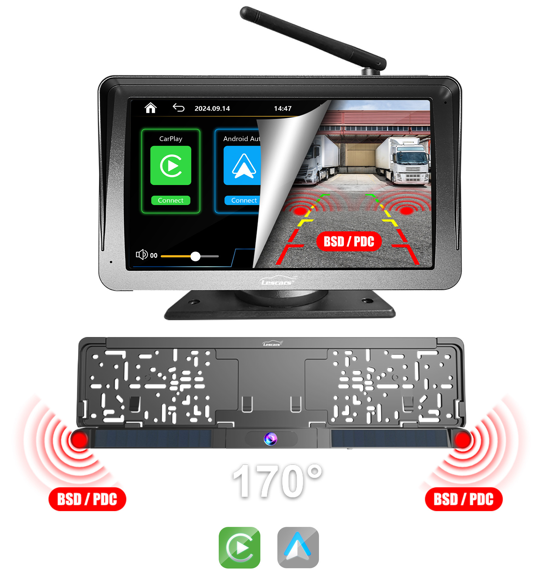 Kabellose Funkübertragung mit Solarstromversorgung:Bild und Warnton werden drahtlos übertragen, ohne dass Kabel nach vorne verlegt werden müssen. Kamera und Abstandssensoren befinden sich in der Kennzeichenhalterung und werden per Solar mit Strom versorgt. Die Funkverbindung zum Monitor erfolgt automatisch.