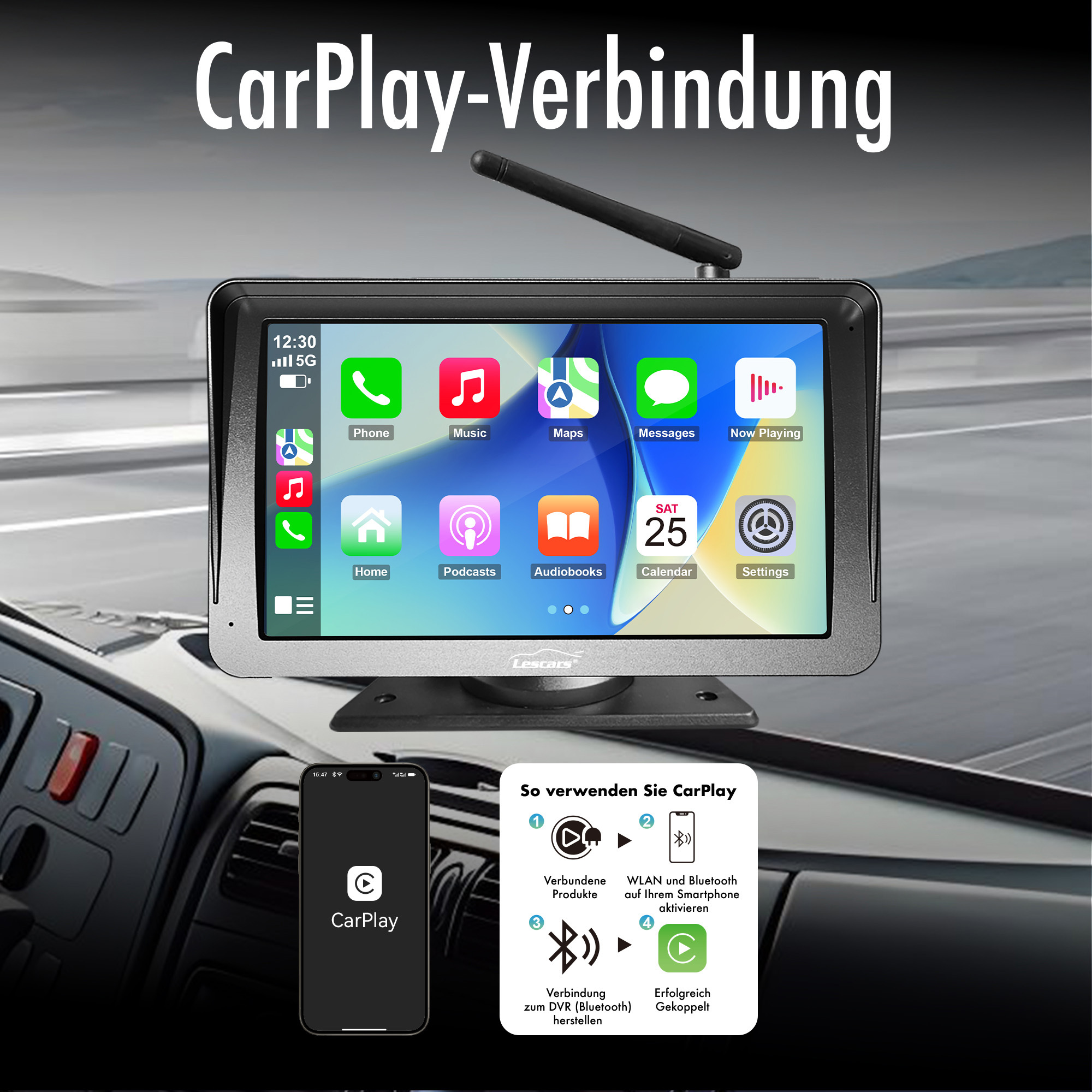 CarPlay- und Android Auto-Integration:Der Monitor ermöglicht die kabellose WLAN-Verbindung zu Smartphones für den Zugriff auf CarPlay und Android Auto. Navigations-Apps, Podcasts und Sprachassistenten lassen sich über das Touchdisplay bedienen.