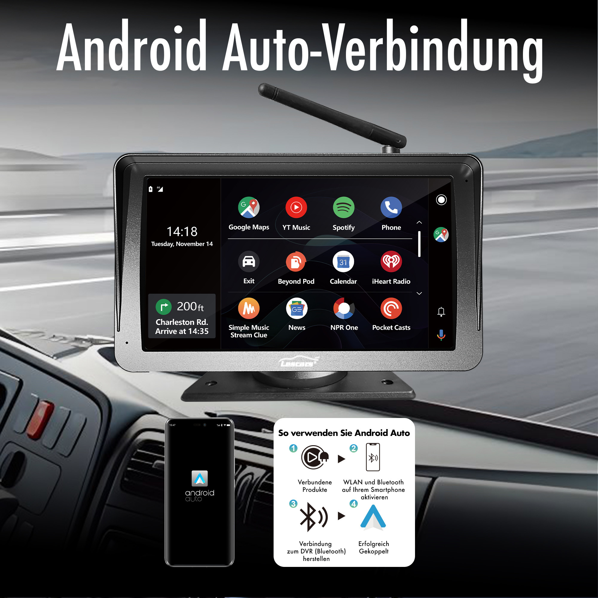 Screen-Mirroring und Medienwiedergabe:Eine Screen-Mirroring-Funktion für iPhone und Android ist integriert. Videos, Musik und Bilder lassen sich von microSD-Speicherkarten wiedergeben.
