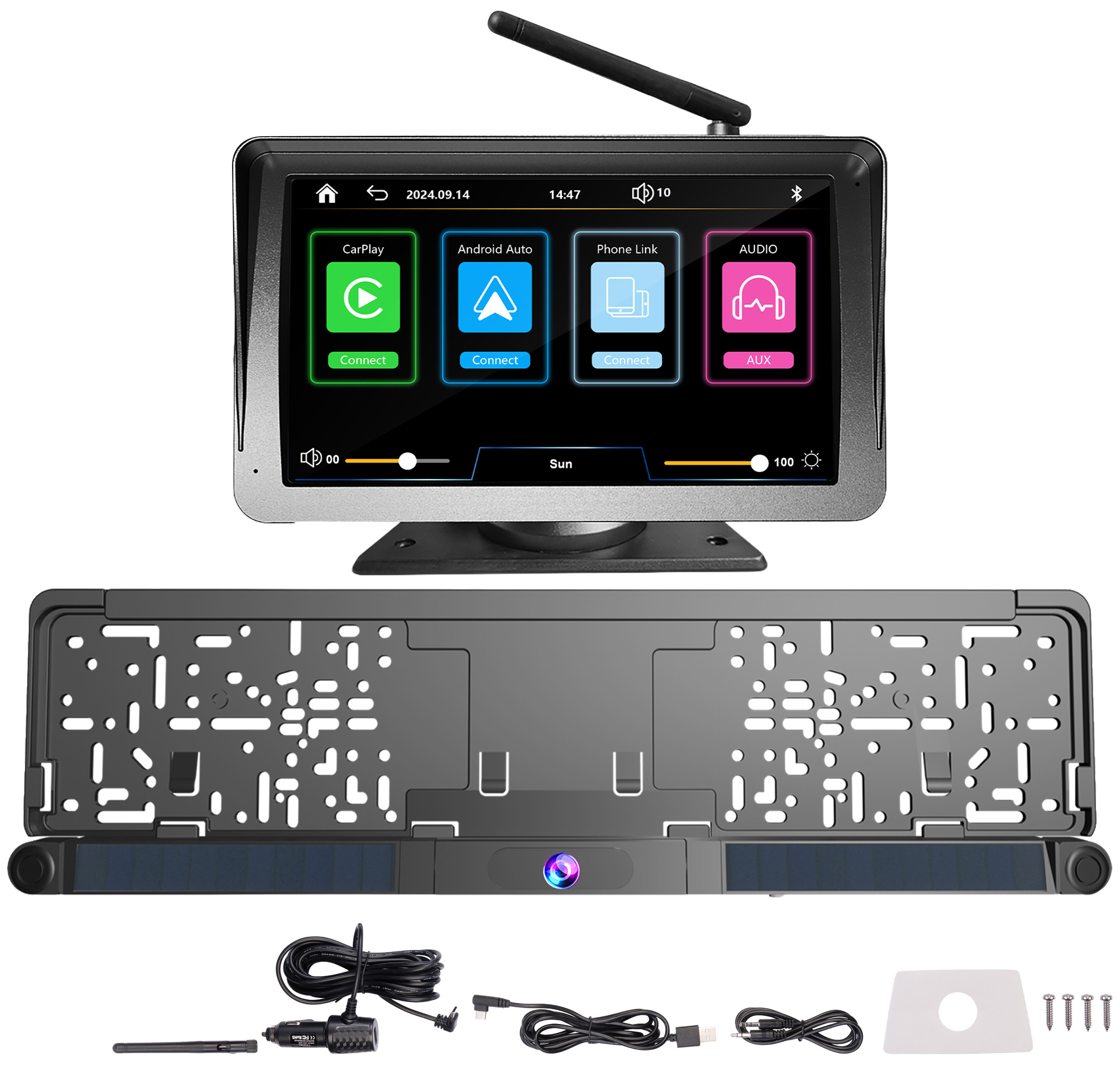 (lifepr) (Buggingen, 28.01.2026) Rückfahrhilfe mit Multimedia-Integration und App-Anbindung: Das kabellose Rückfahrkamera-System PA-755 verbindet Einparkhilfe und Multimedia-Funktionen auf einem 7-Zoll-Farbmonitor. Die in einer Kennzeichenhalterung installierte Kamera überträgt HD-Bilder per Funk und arbeitet mit integrierten Abstandssensoren zusammen. Solarzellen übernehmen die Stromversorgung des Systems, wodurch eine Verkabelung überflüssig wird. Der Monitor ist mit CarPlay und Android Auto kompatibel und verfügt über eine drahtlose WLAN-Anbindung für Smartphones. Freisprechfunktion, Musikwiedergabe und Bildschirmspiegelung für mobile Geräte gehören ebenfalls zum Funktionsumfang. Über einen microSD-Kartenslot können zusätzlich Videos, Musik und Bilder direkt am Gerät abgespielt werden.