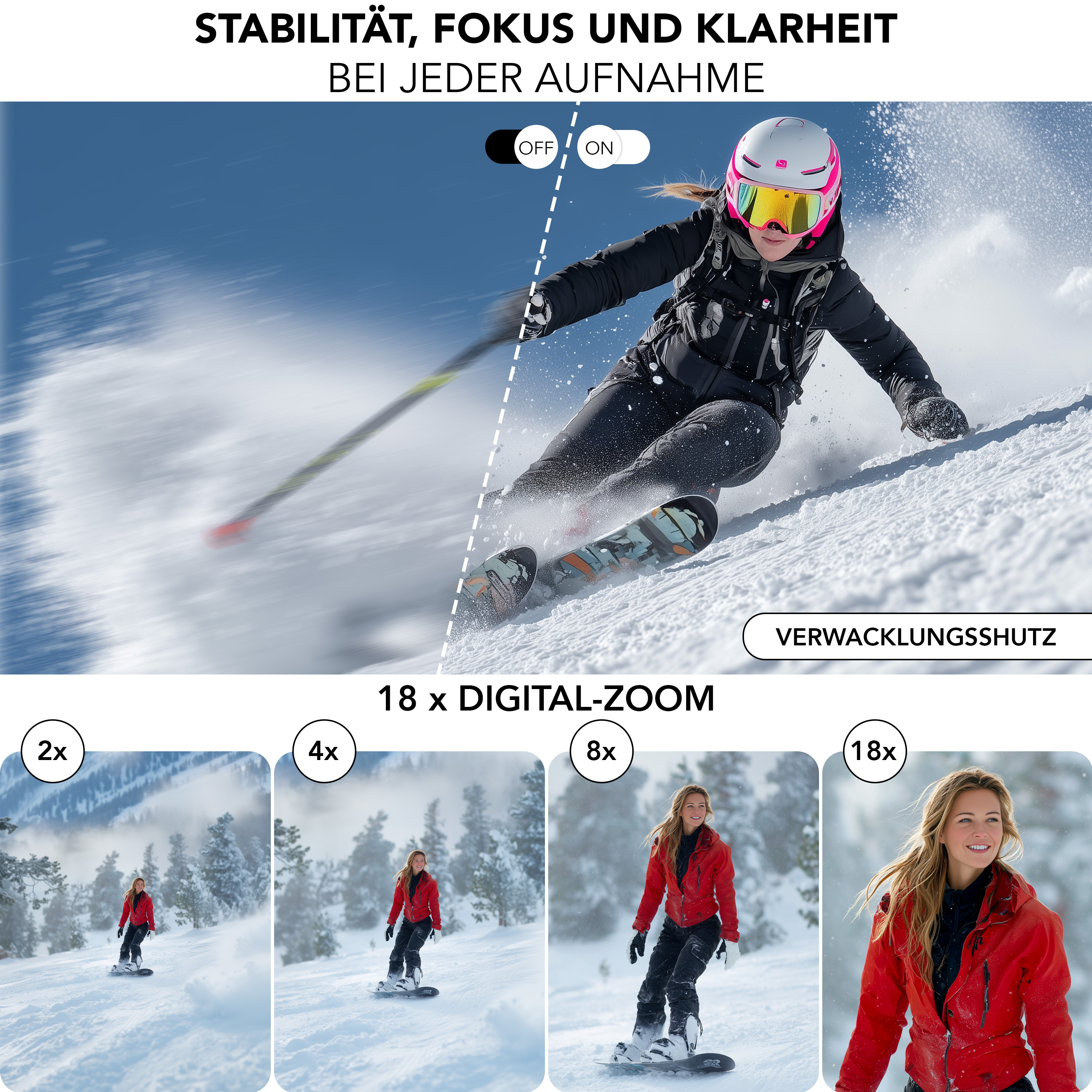 18-fach-Digitalzoom mit Autofokus für variable Distanzen: Der leistungsstarke Digitalzoom bringt entfernte Motive nah heran, ohne dass ein Standortwechsel nötig ist. Der Autofokus stellt rasch scharf und erleichtert präzise Bildkompositionen. Bei schwachem Licht sorgt ein LED-Blitzlicht für verlässliche Ergebnisse – auch in Innenräumen.
