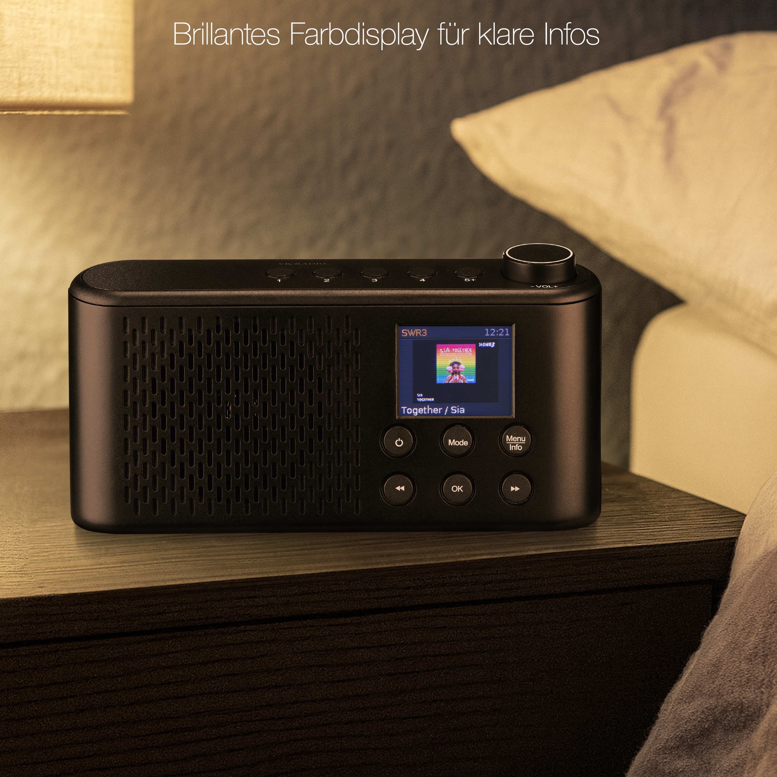 Der integrierte Li-Ion-Akku ermöglicht bis zu acht Stunden Musikgenuss ohne Steckdose. Das Radio begleitet zuverlässig durch den Tag - ob im Wohnzimmer, auf dem Balkon oder unterwegs.