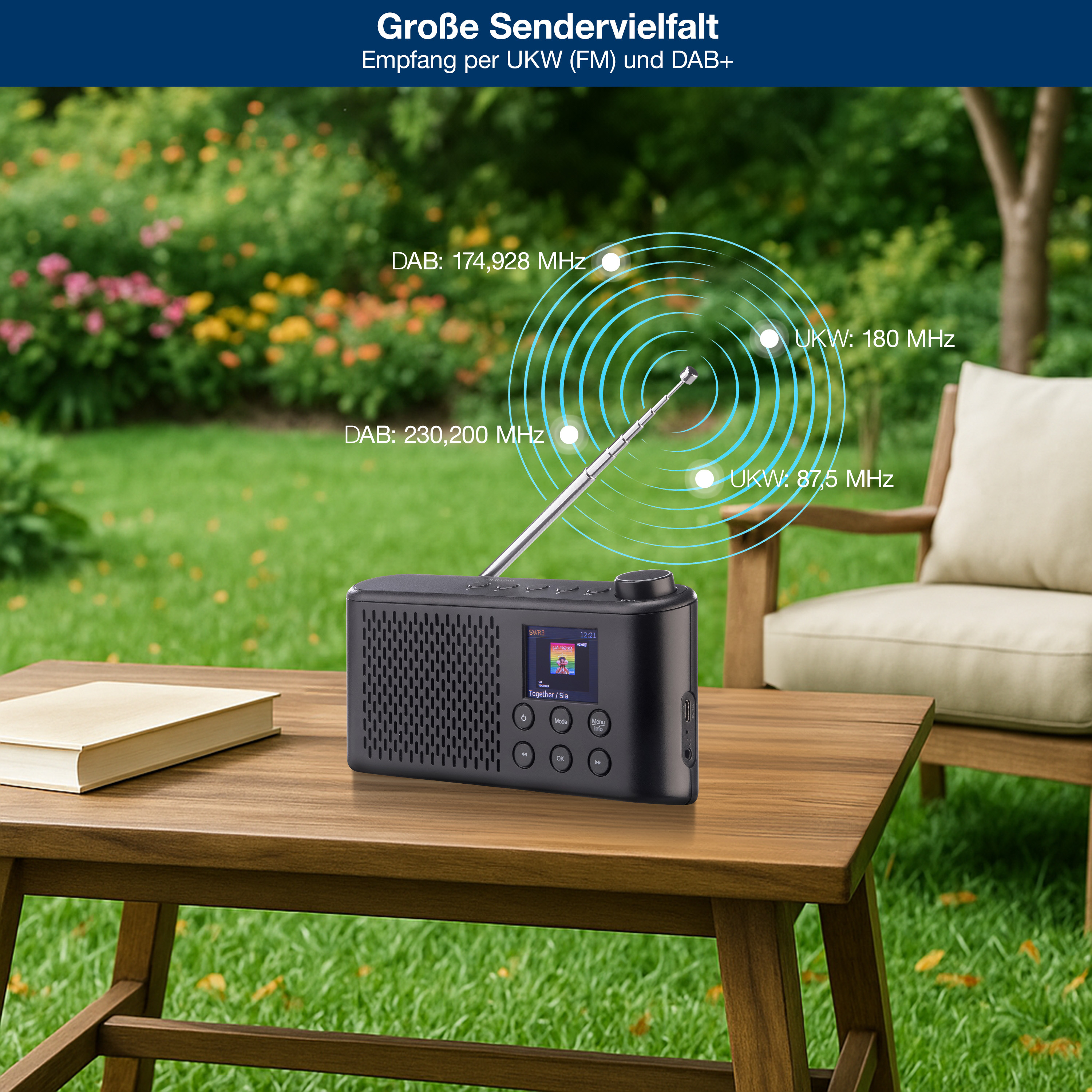 (lifepr) (Buggingen, 05.03.2026) Das mobile Akku-Digitalradio von VR-Radio empfängt DAB+ und FM und zeigt Senderinformationen, Titel und die Uhrzeit auf einem großen TFT-Farbdisplay an. Der integrierte 6-Watt-Lautsprecher liefert einen satten Klang, während der Akku eine Laufzeit von bis zu acht Stunden ermöglicht. Über fünf Sendespeicher-Tasten können bis zu 40 gespeicherte DAB+- und FM-Sender direkt aufgerufen werden. Und via Bluetooth 5.3 ist kabelloses Musikstreaming vom Smartphone oder Tablet möglich. Ein Ausschalt-Timer und ein Wecker mit zwei Alarmzeiten ergänzen die umfangreichen Funktionen des mobilen Digitalradios.