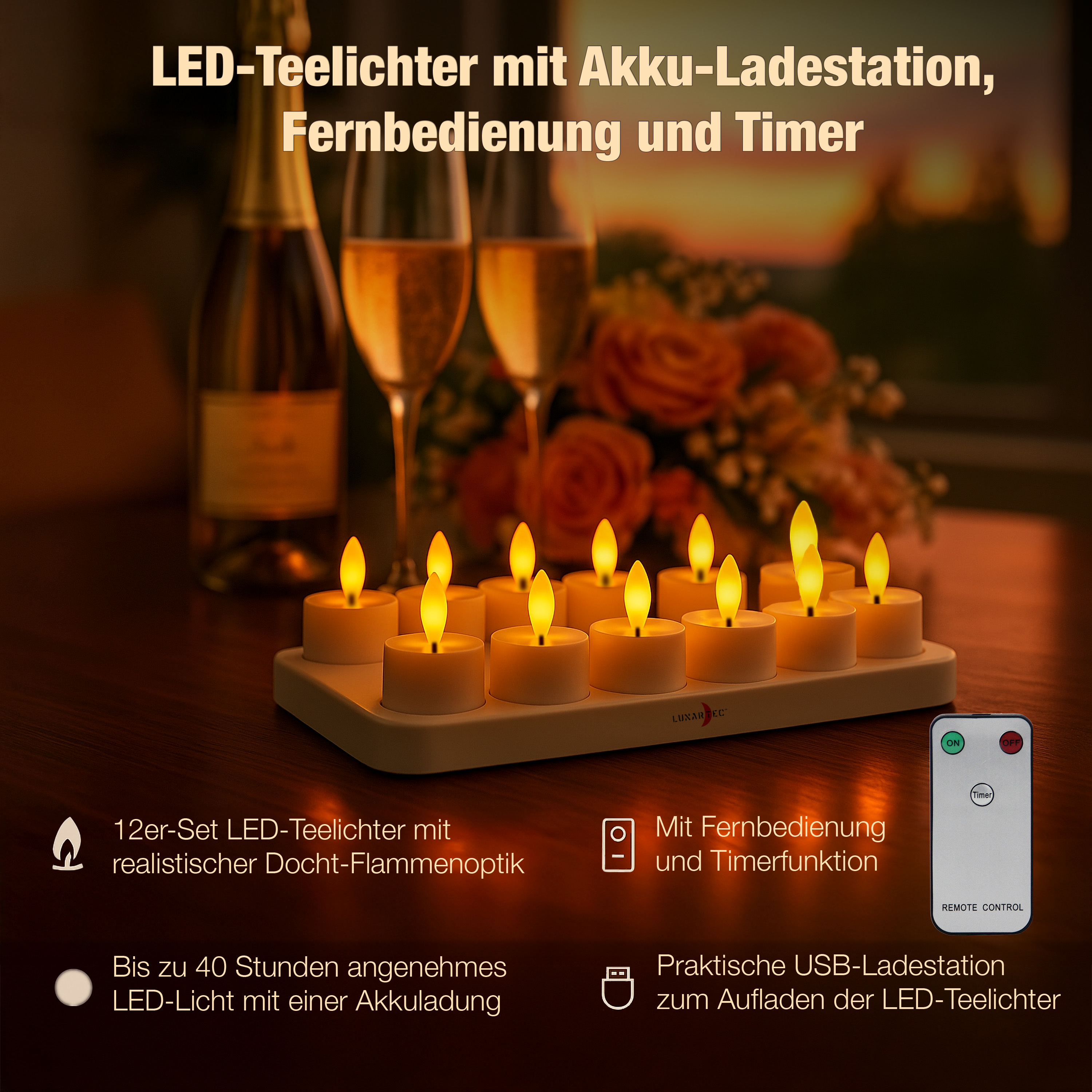 Stimmungsvolle Beleuchtung für gemütliche Momente:Warmes Kerzenlicht ohne Ruß oder Brandgefahr – das bieten die wiederaufladbaren LED-Teelichter von Lunartec. Dank realistischer Docht-Flammenoptik entsteht ein stimmungsvolles Ambiente, das sich für romantische Abende, festliche Anlässe oder den gemütlichen Alltag zuhause gleichermaßen eignet.