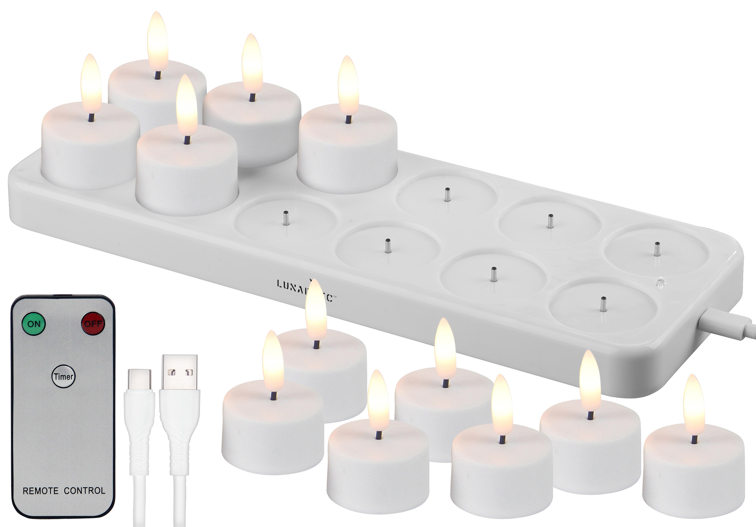 Lunartec 24er-Set LED-Akku-Teelichter mit USB-Ladestation, Fernbedienung, Timer