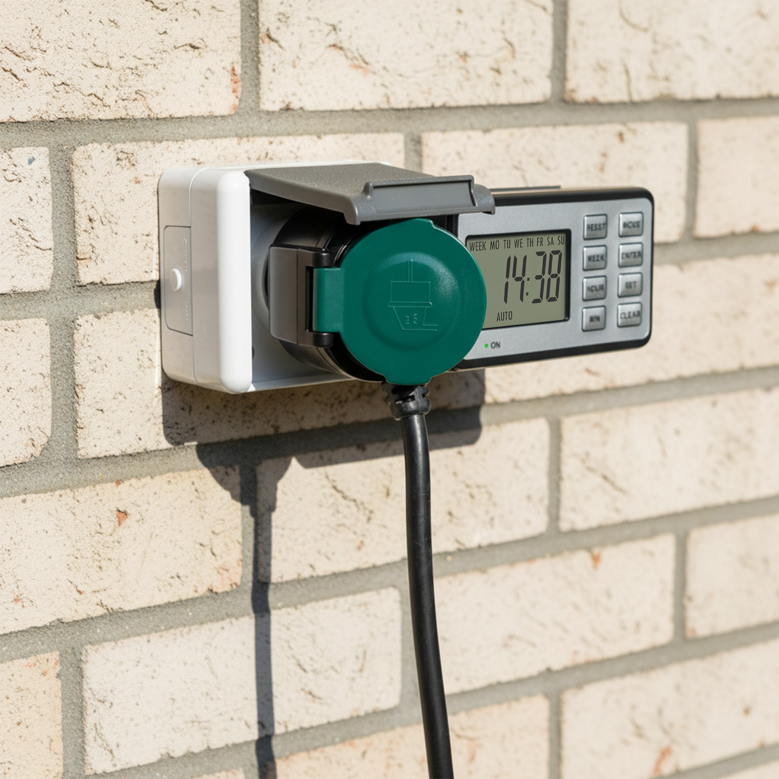 Zuverlässige Zeitsteuerung im Außenbereich: Außenbeleuchtung, Gartenpumpe oder Weihnachtslichter lassen sich mit der digitalen Zeitschaltuhr von revolt minutengenau und vollautomatisch ein- und ausschalten – ganz ohne manuelles Eingreifen.