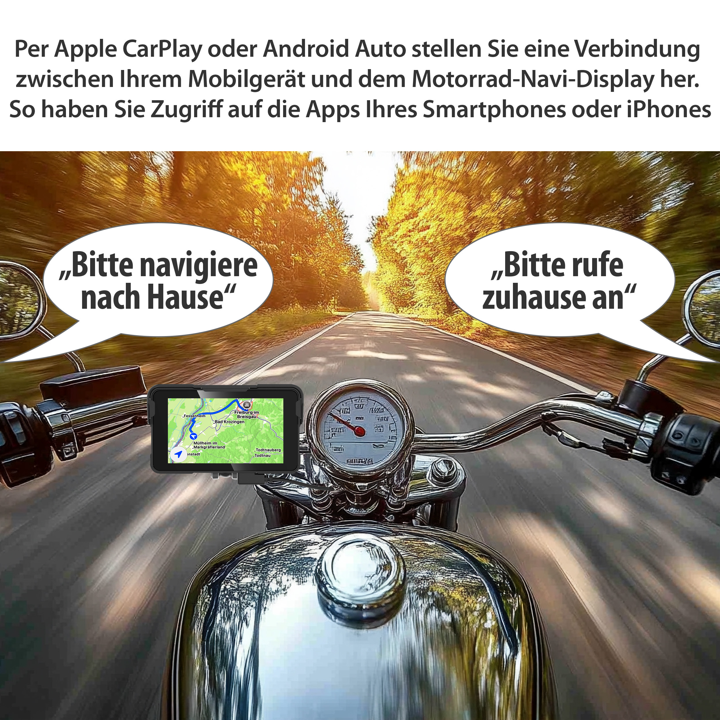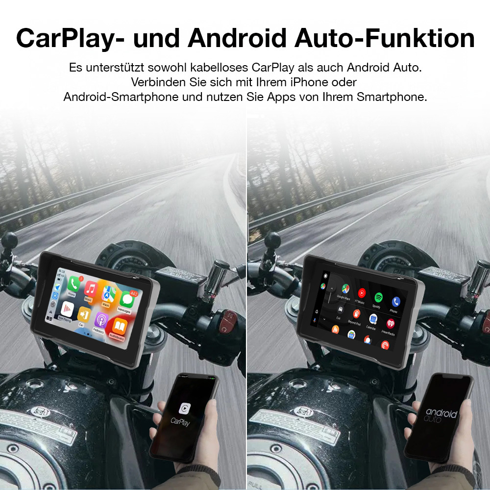 Modernes Upgrade für das Motorrad: Per Kopplung mit einem iPhone oder Android-Smartphone überträgt das Motorrad-Navi-Display von Lescars Apps via CarPlay oder Android Auto direkt auf den Bildschirm – Navigation und weitere Anwendungen sind so während der Fahrt zugänglich, während das Smartphone sicher verstaut bleibt.
