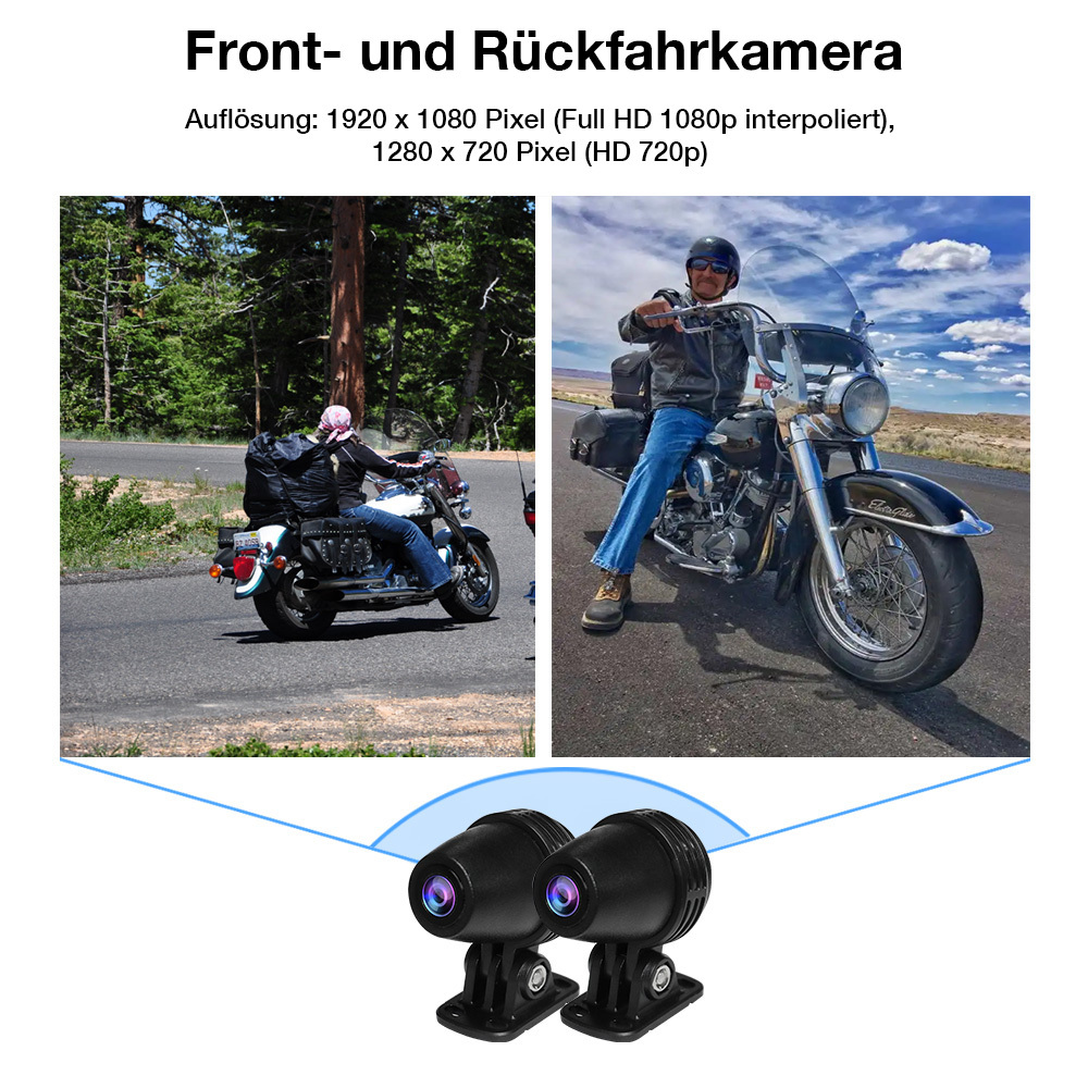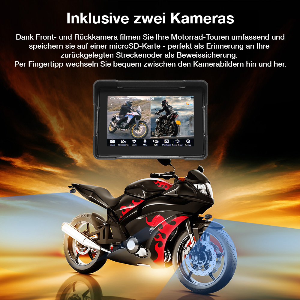 Inklusive zwei Kameras: Das Bundle enthält eine Front- und eine Rückkamera, die Motorradtouren umfassend aufzeichnen und die Aufnahmen auf einer microSD-Karte speichern – als Erinnerung an gefahrene Strecken oder zur Beweissicherung. Per Fingertipp lässt sich jederzeit zwischen den beiden Kamerabildern wechseln.