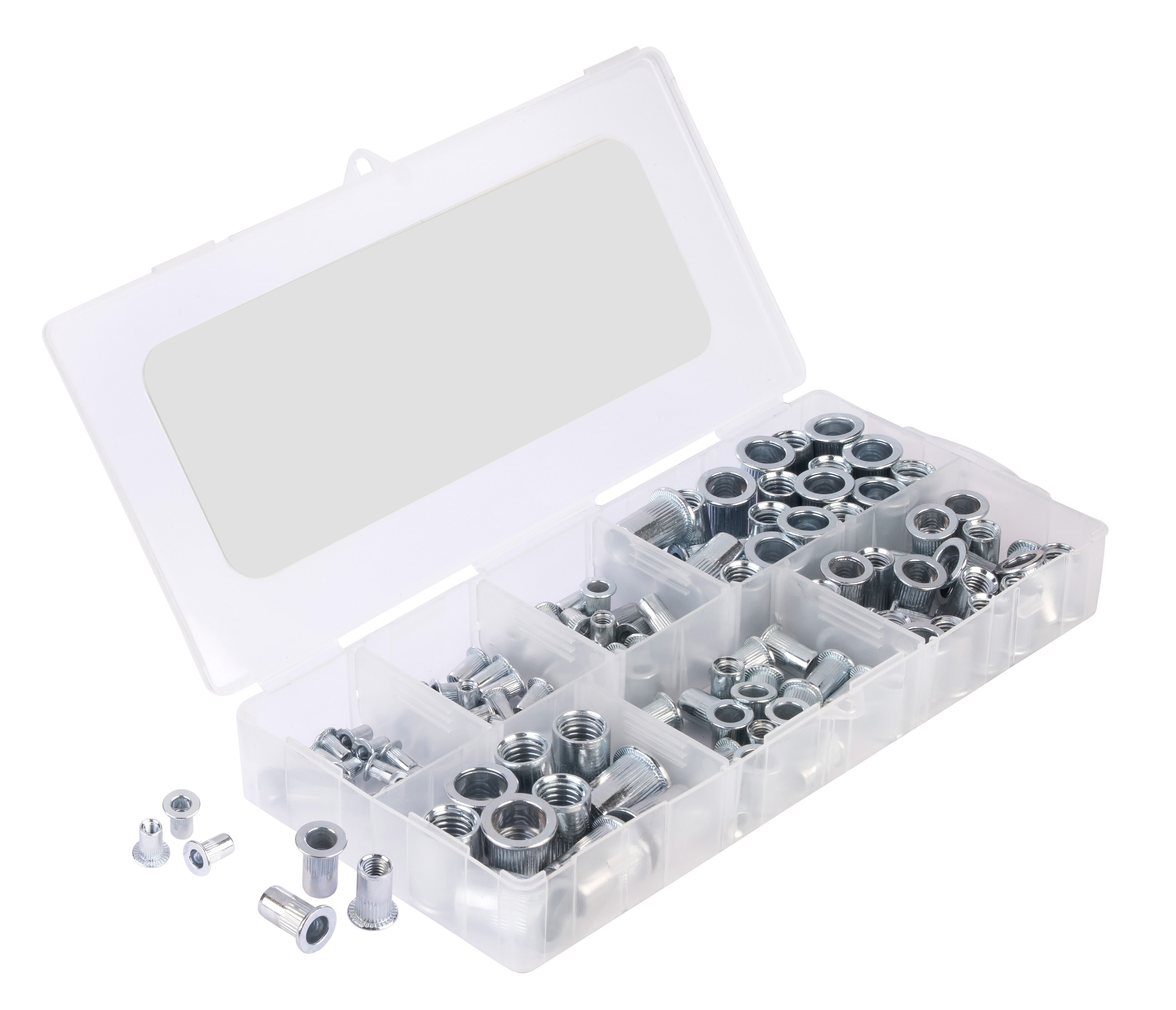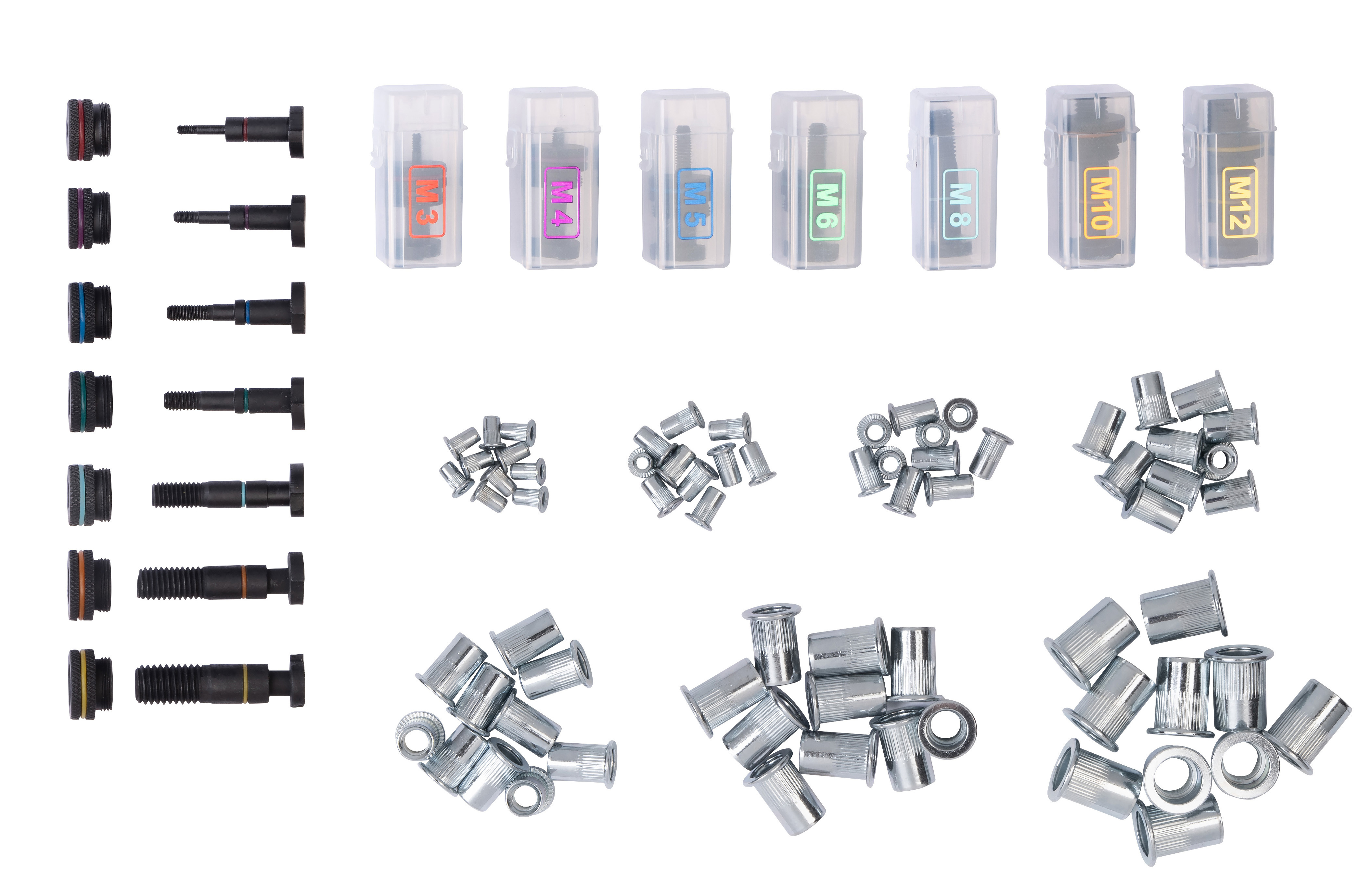 Vielfältige Größen sofort griffbereit:Im Lieferumfang enthalten sind 80 Edelstahl-Nietmuttern sowie passende Dorne für M3 bis M12 – übersichtlich sortiert in einem praktischen Koffer für ein breites Spektrum an Anwendungen.