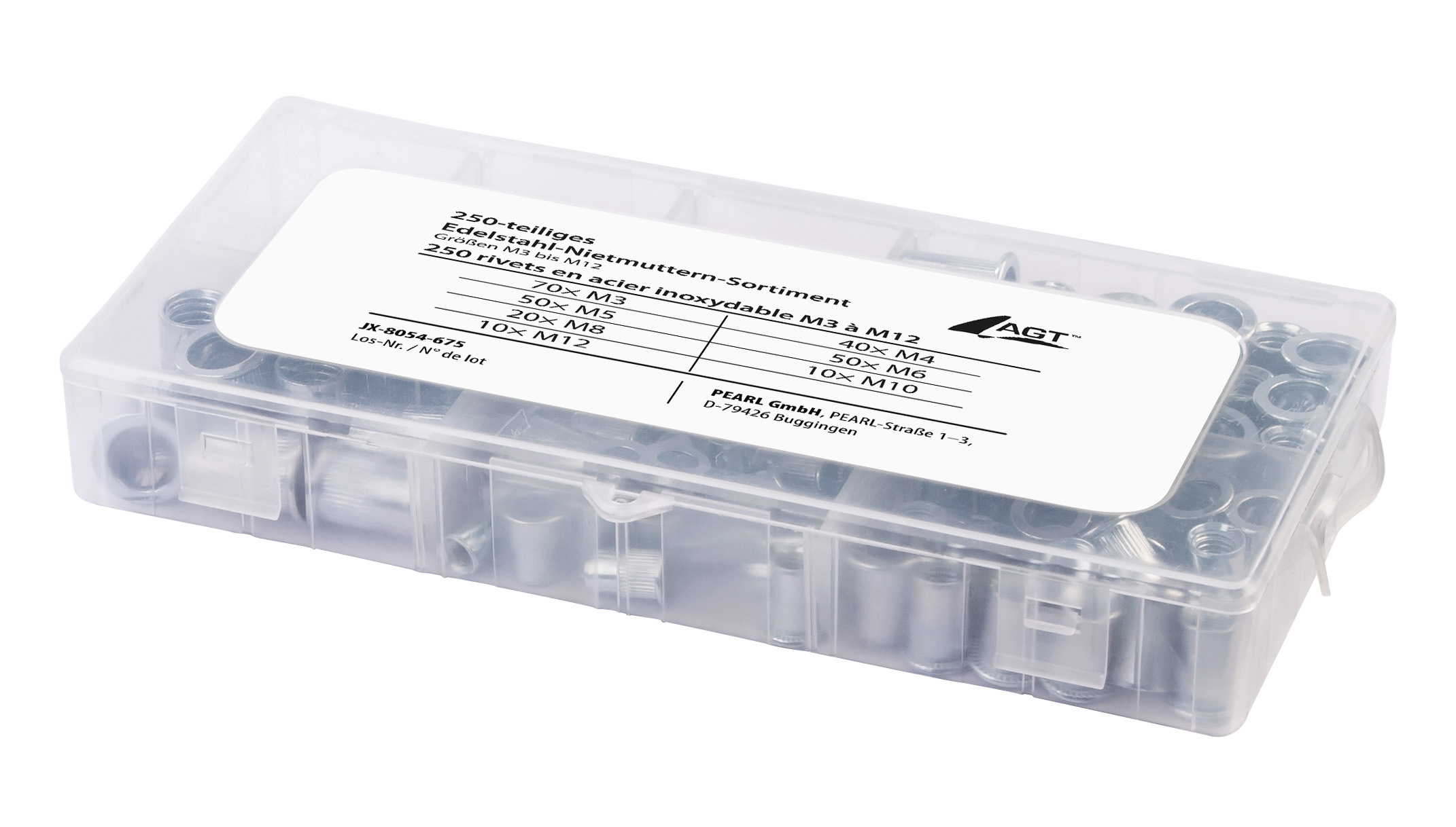 Das AGT 250-teiliges Edelstahl-Nietmuttern-Sortiment, Größen M3 bis M1 ist ab sofort bei pearl.de unter der Bestellnummer JX-8054-625 zum Preis von 24,99 EUR erhältlich. Das Produkt ist auch bei emall.com_Schweiz verfügbar.