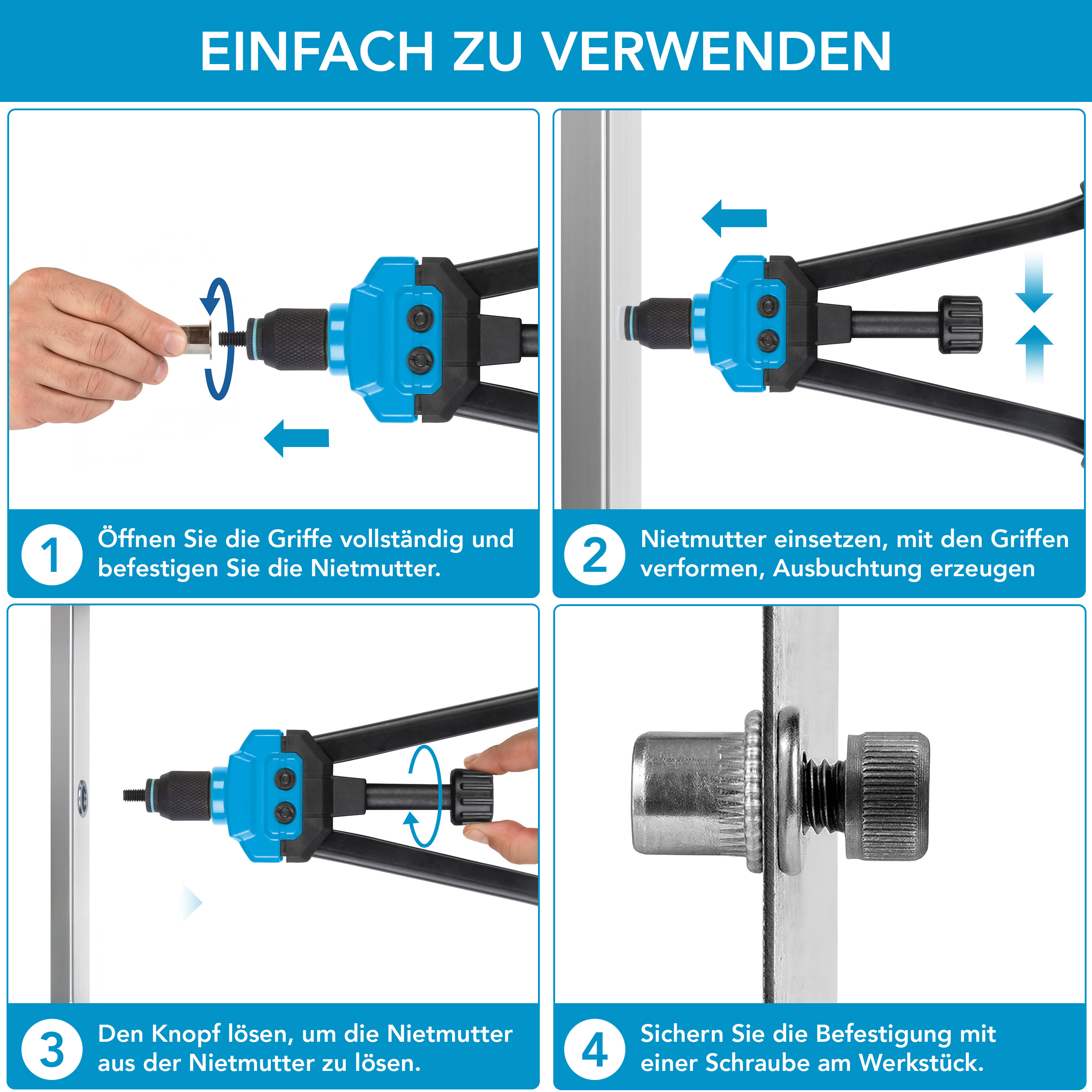 (lifepr) (Buggingen, 01.04.2026) Die 40 cm lange Nietmutternzange von AGT ermöglicht kraftsparendes Arbeiten bei der Blechbearbeitung, auch an Auto- und Motorradkarosserien. Über eine Stellschraube lässt sich die Ziehtiefe individuell einstellen, sodass bei unterschiedlichen Materialien und Nietgrößen stets präzise Ergebnisse erzielt werden. Im Lieferumfang sind 80 Edelstahl-Nietmuttern sowie Dorne für die Gewindegrößen M3 bis M12 enthalten. Alles ist übersichtlich in einem praktischen Koffer verstaut. Bei erweitertem Bedarf ist ergänzend ein 250-teiliges Sortiment mit Edelstahl-Nietmuttern in den Größen M3 bis M12 erhältlich. Sowohl die Zweihand-Zange als auch das Sortiment eignen sich für Reparaturen, Bauprojekte und DIY-Anwendungen an Metall, Kunststoff und weiteren Materialien.