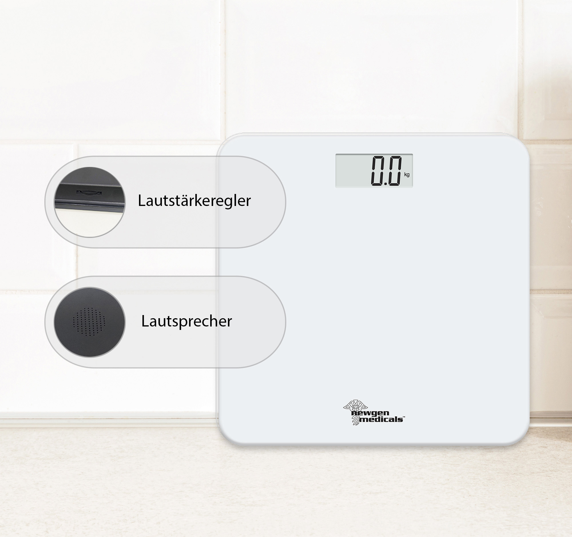 Klar verständliche Sprachausgabe in fünf Sprachen: Die Personenwaage von newgen medicals gibt das gemessene Gewicht gut hörbar auf Deutsch, Englisch, Französisch, Italienisch und Spanisch aus – ein Bücken oder Ablesen entfällt damit. Die Sprachausgabe ist besonders hilfreich, wenn das Display nicht immer klar erkennbar ist.