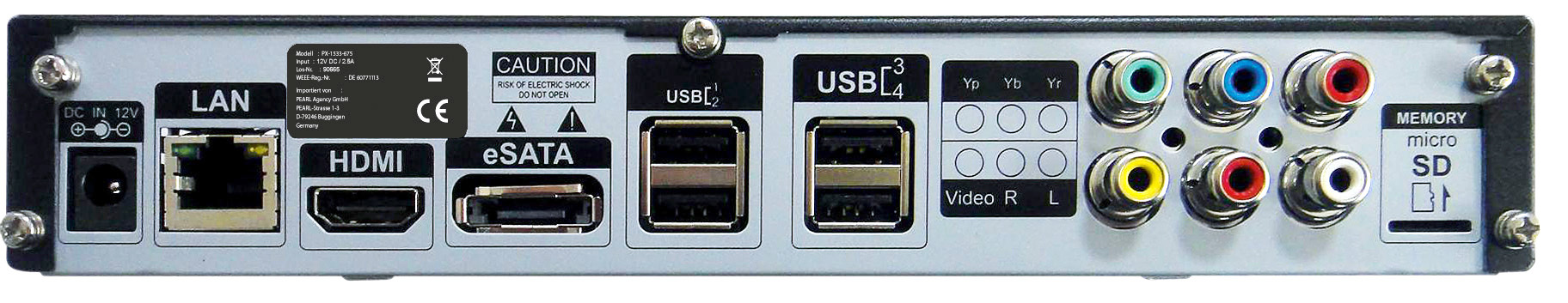 - Anschlüsse: 4x USB2.0, RJ45 (10/ 100Mbit), HDMI, A/V-& YPbPr-Klinke-Out, eSATA, microSD-Slot (bis 32 GB)