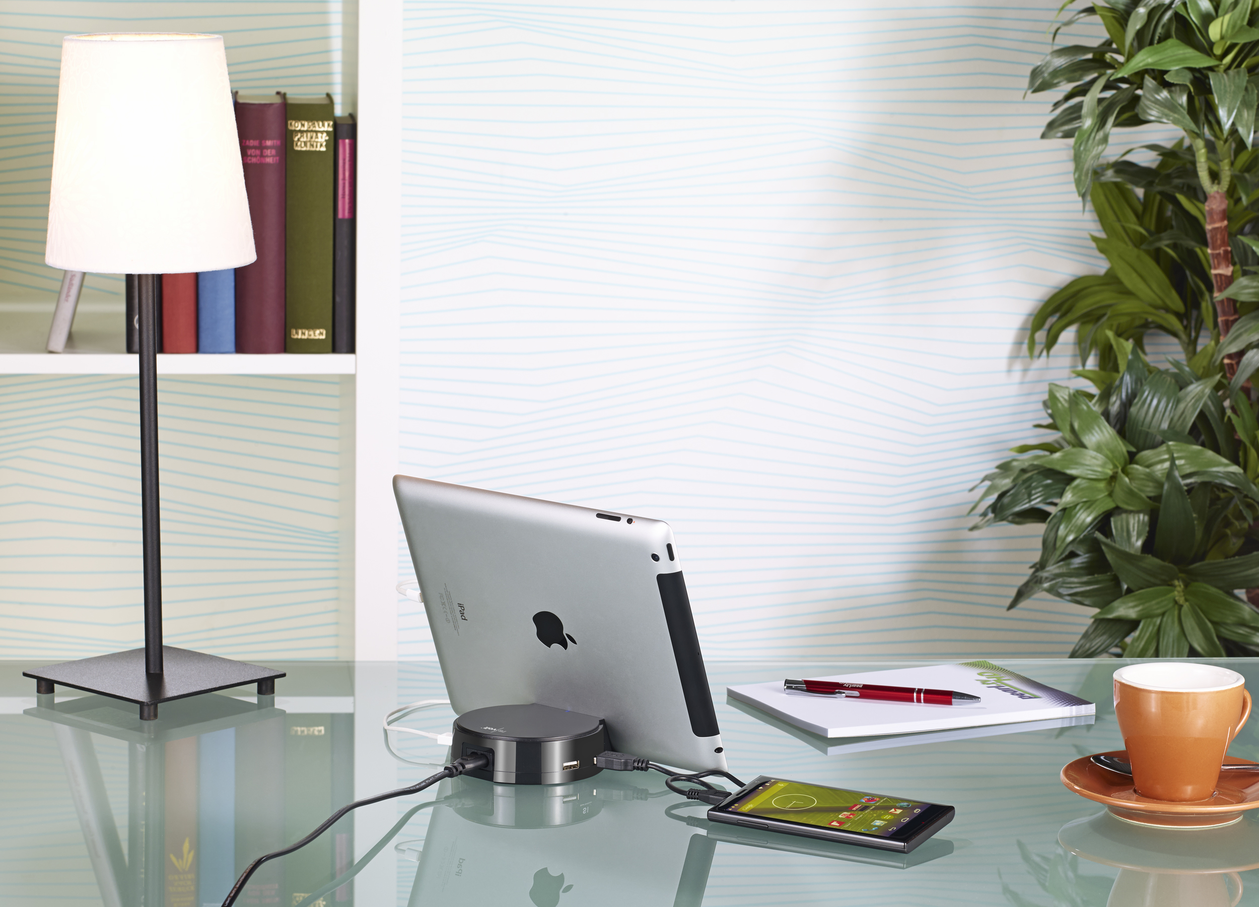 Zusatzvorteil: In der integrierten Geräte-Halterung kann man während des Ladevorgangs bequem den Tablet-PC oder das Smartphone abstellen. So ist der Liebling stets sicher verstaut und liegt nicht im Weg.
