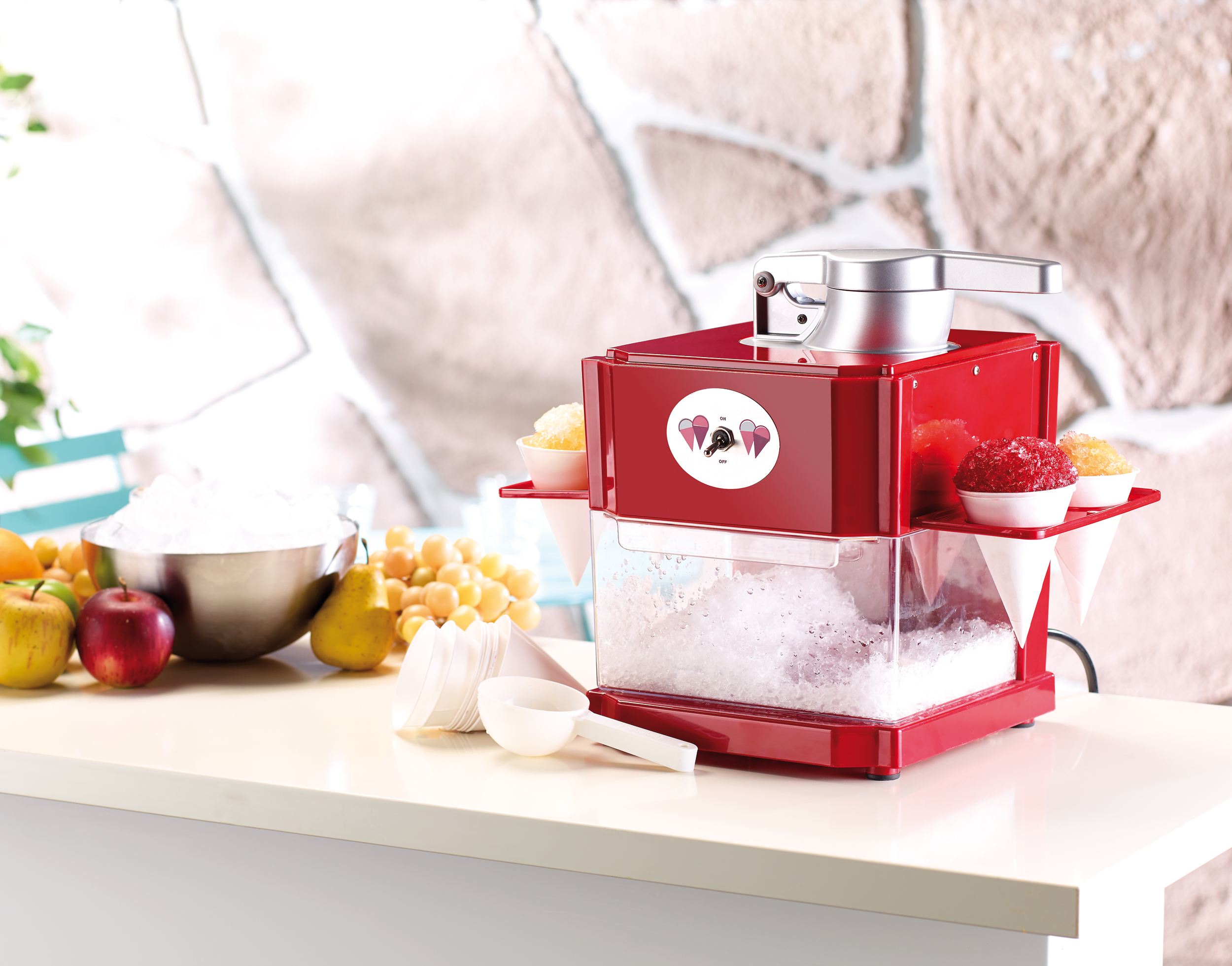 (lifepr) (Buggingen, 12.08.2015) Sie könnten glatt einer berühmten französischen Trickfilmserie entsprungen sein, in der es hauptsächlich um Süßes und Früchte geht: Gemeint sind die knallroten Shaved-Ice-Maker der Marke Rosenstein & Söhne. Die Geräte sind der beste Beweis für einen neuen Trend in Deutschlands Küchen: Eis wird jetzt in Form hauchdünner Scheibchen genossen. Shaved-Eis, der Sommertrend aus Hawaii, ist schwer auf dem Vormarsch.