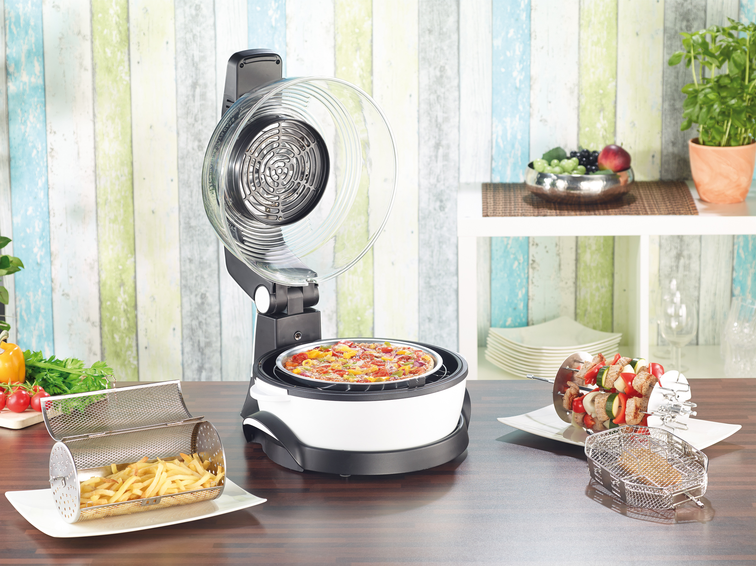 Für die Zubereitung des Gerichts wird einfach ein passendes Programm ausgewählt oder Zeit, Temperatur und Rotationsgeschwindigkeit manuell eingestellt. Der mobile Heißluftofen lässt keine Wünsche offen: 14 Liter Fassungsvermögen, 2 Gar-Ebenen und jede Menge Zubehör! So bereitet man auf einfache Weise vielseitige Mahlzeiten für Familie und Freunde zu!