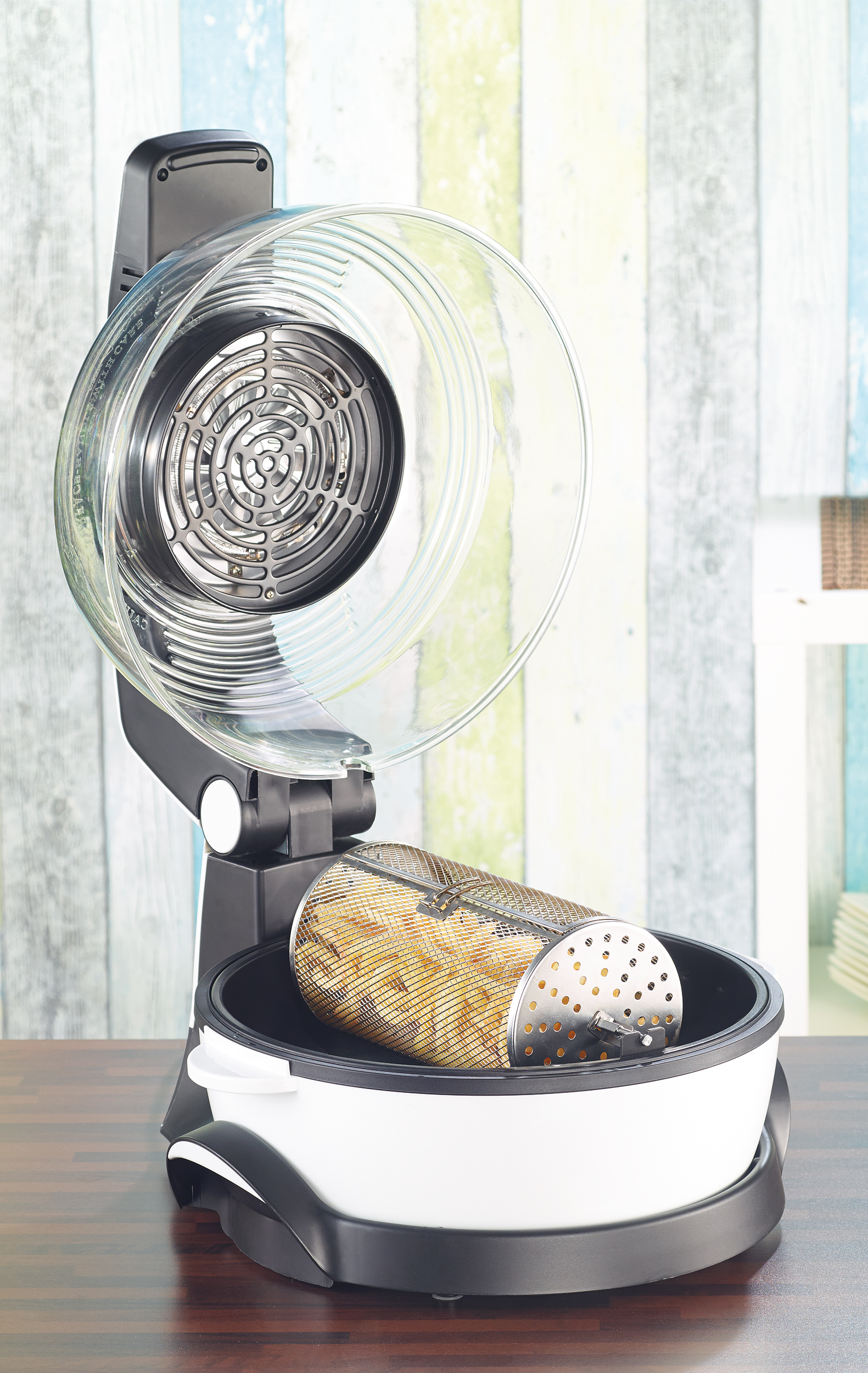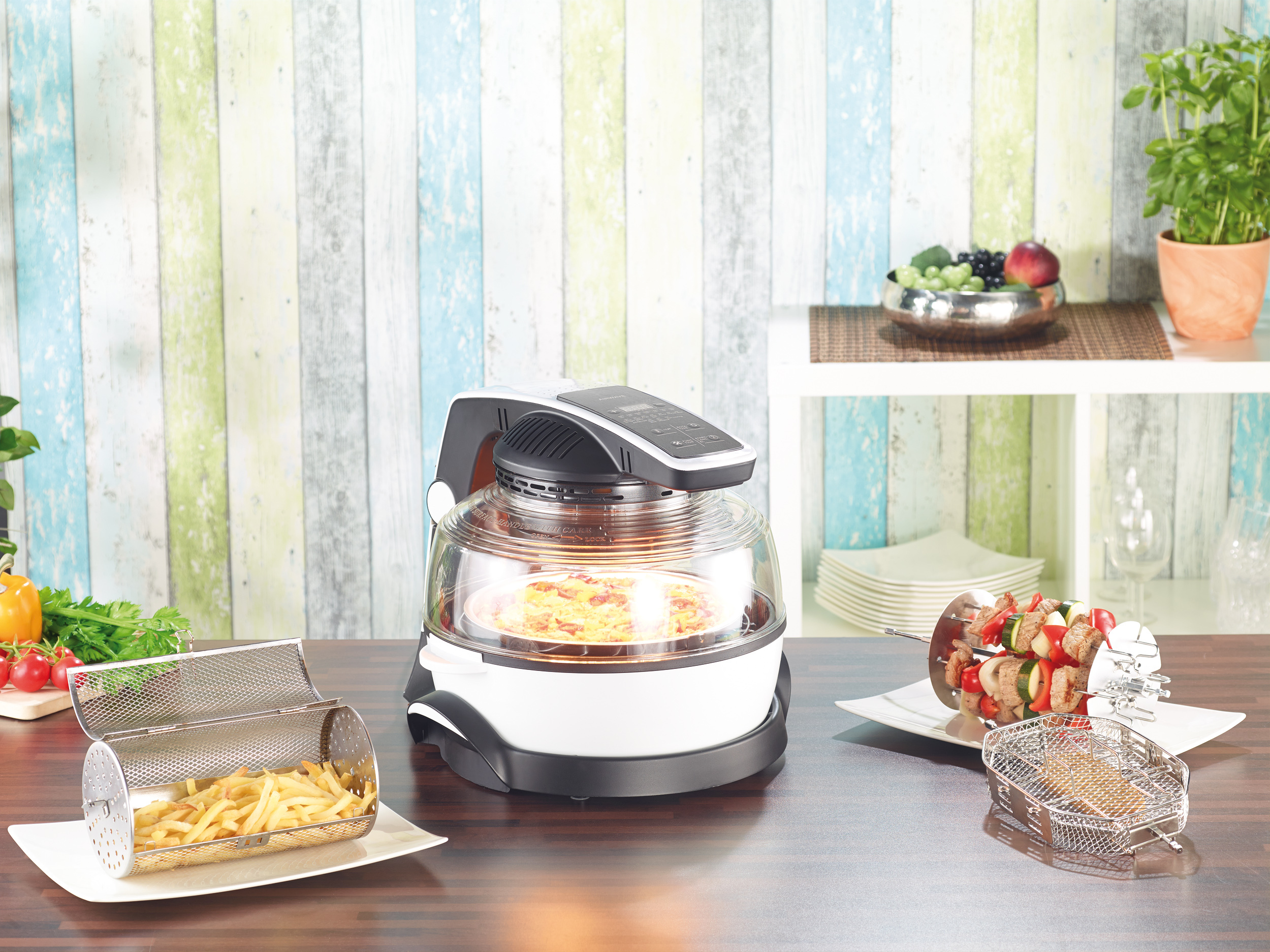 (lifepr) (Buggingen, 25.09.2015) Diesen praktischen Helfer kann jeder gebrauchen: Die Heißluftfritteuse von Rosenstein & Söhne ist die ideale Kombination aus Erhitzen mit Licht und dem bekannten Heißluft-Prinzip. Ein Halogen-Heizelement erhitzt den Ofen blitzschnell und mit minimaler Vorheizzeit auf die gewünschte Temperatur. Der Ventilator verteilt die warme Luft gleichmäßig im Garraum. So spart man beim Zubereiten bis zu 20 % Energie und 50 % der Zeit! Vitalfritteuse und Halogenofen in einem: Damit lässt sich alles gesund, schnell, energiesparend und ganz ohne Fett zubereiten! Ob perfekte Pommes, Kartoffelecken, knusprige Chicken-Wings, gedämpftes Ofengemüse, Hühnerschenkel oder der Sonntagsbraten: Alles wird im Konvektionsofen ruckzuck fertig, ohne an Geschmack und Saftigkeit zu verlieren. Außerdem verwöhnt der gläserne Alleskönner mit Grillhähnchen, Fleischspießen, Pizza, Popcorn und vielen anderen Köstlichkeiten.