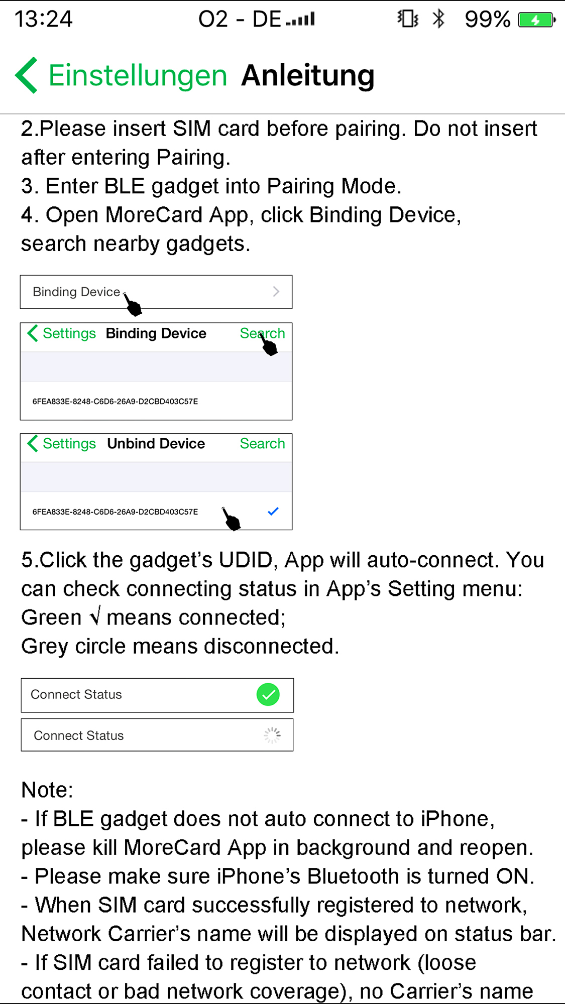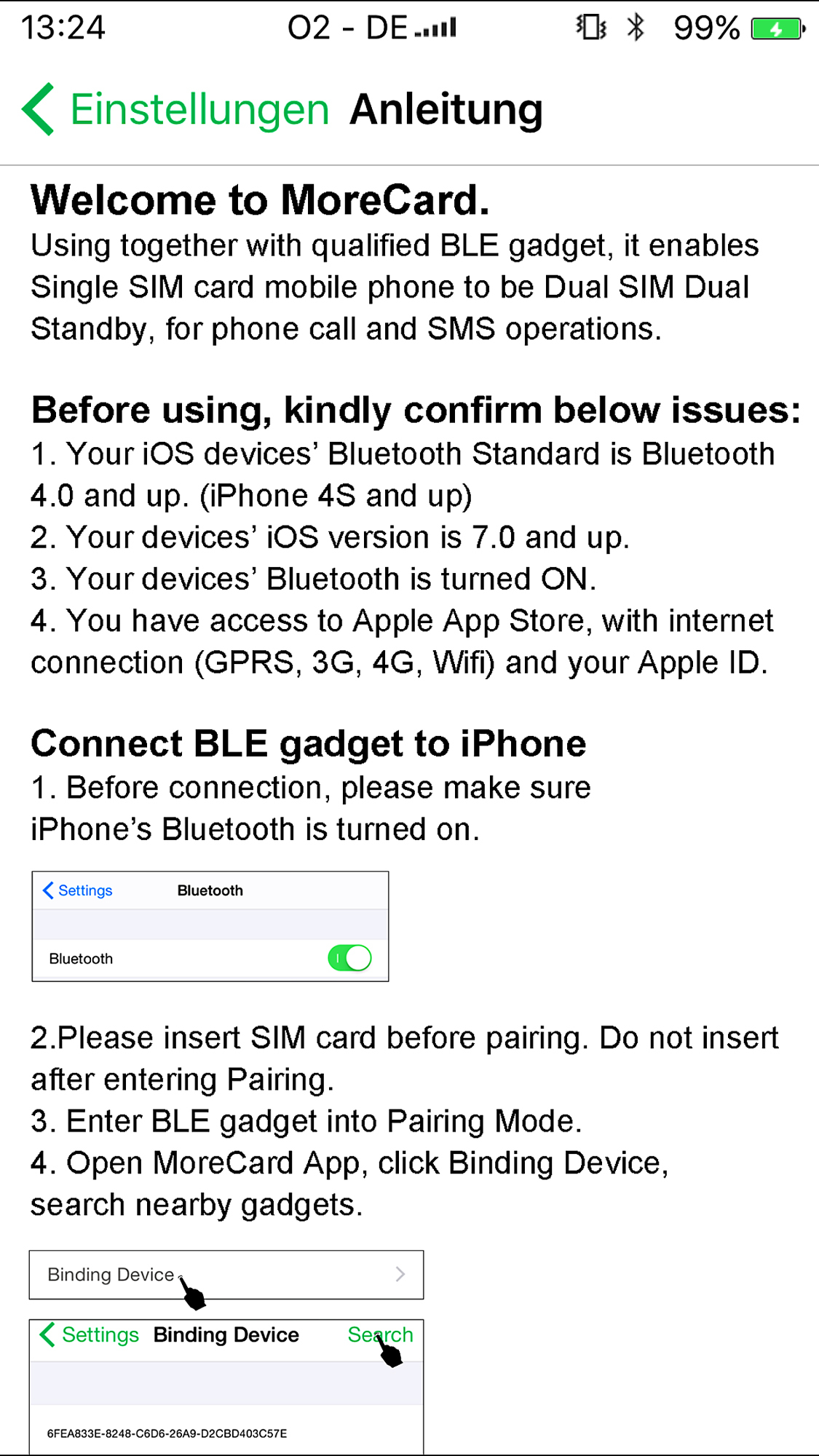 Einfach eine SIM-Karte in den Adapter von Callstel einlegen, diesen einschalten und Bluetooth auf dem iPhone aktivieren.