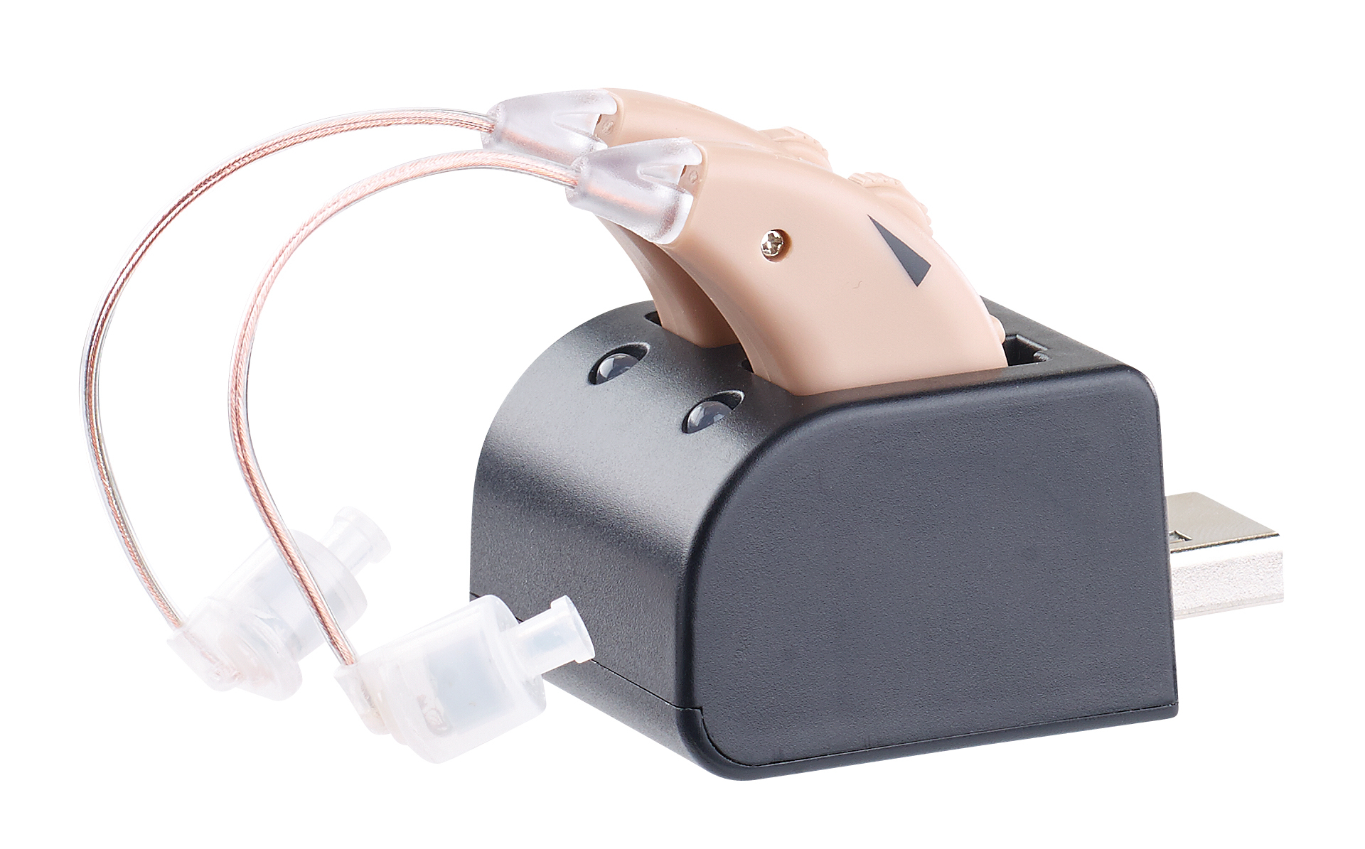Keine Batterien-Kosten: Dank integriertem Akku lässt sich der Hörverstärker einfach per USB aufladen. Sogar beide gleichzeitig an einer Ladestation!