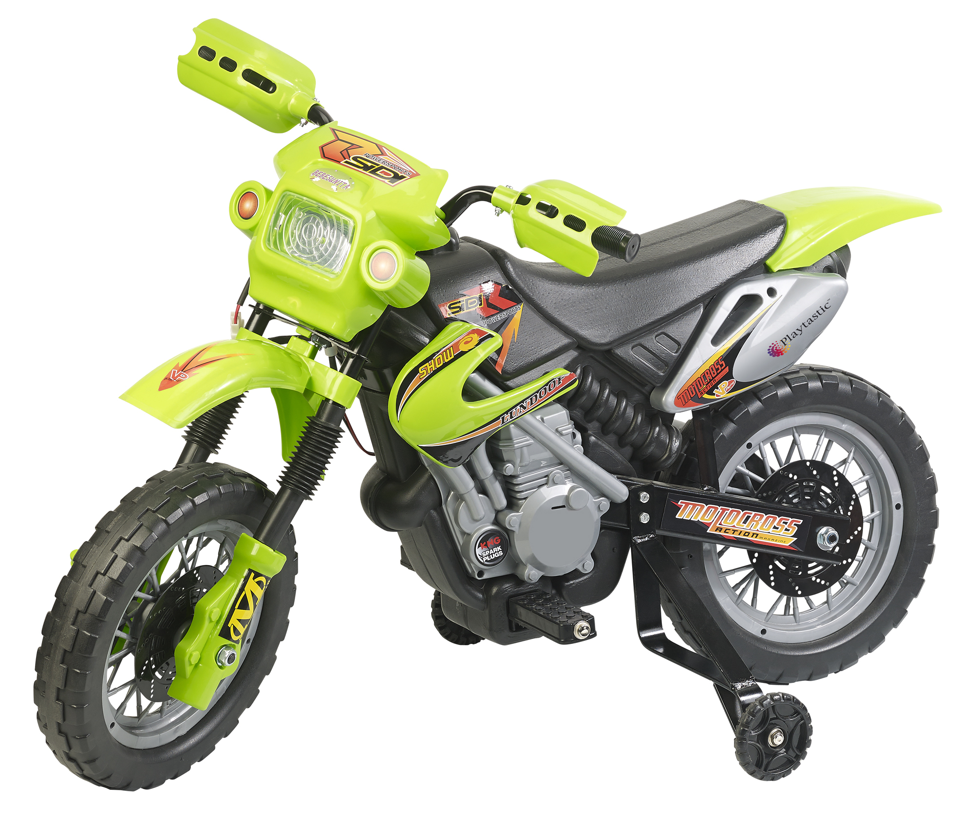 Für Fahrspaß pur: Dank Frontscheinwerfer und Sound-Effekten macht das Fahren gleich doppelt Spaß. Das auffällig grüne Motocross-Design mit bunten Aufklebern macht es zum echten Hingucker. So ist es nicht zu übersehen - das sorgt für Sicherheit!