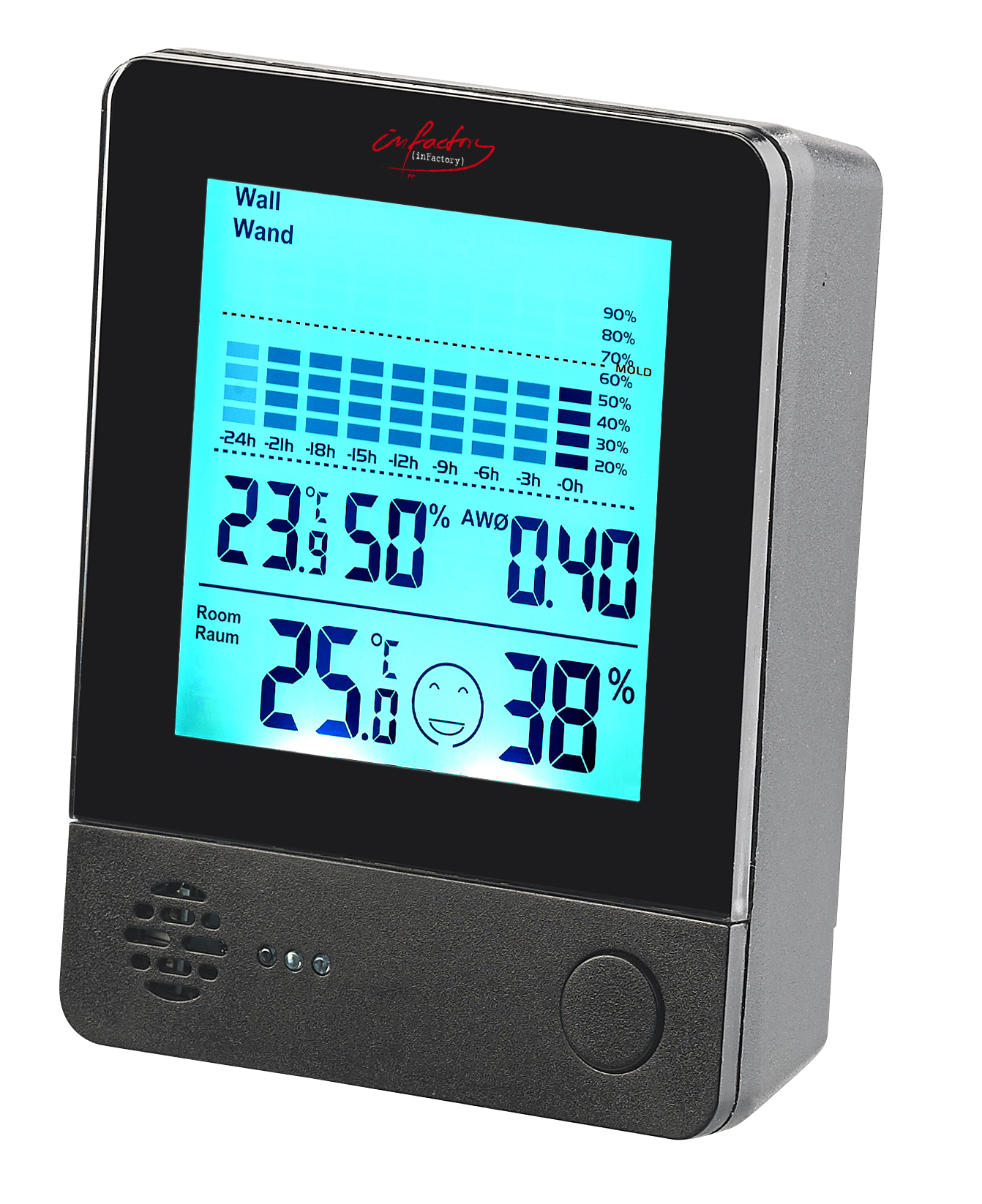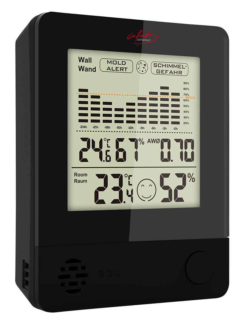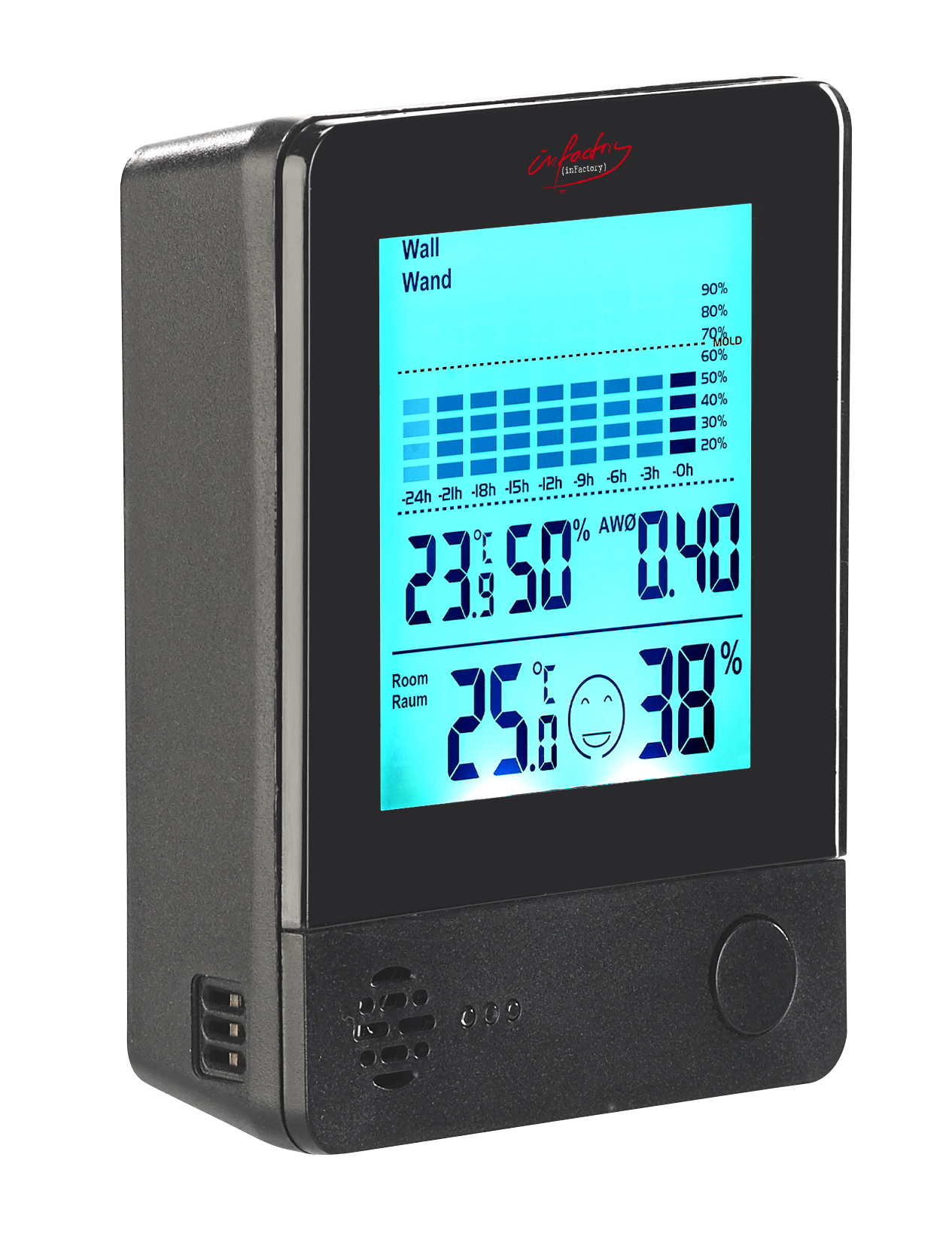Gefährlichem Schimmel vorbeugen und ganz einfach und zuverlässig das Raumklima in den Wohnräumen überwachen. An der Wand montiert misst der Klimaexperte von infactory dank zweitem rückseitigem Sensor sogar die Wandfeuchte.