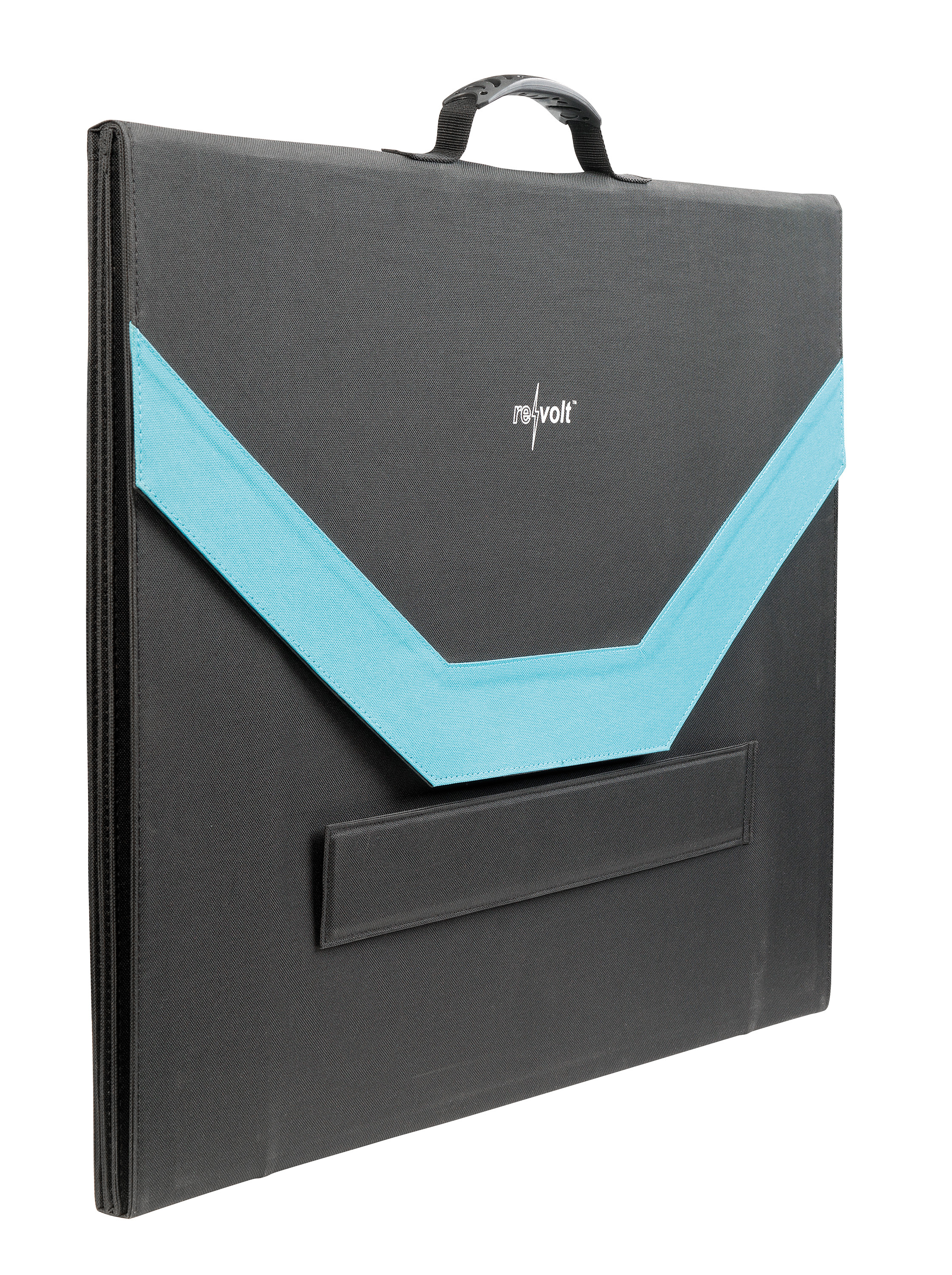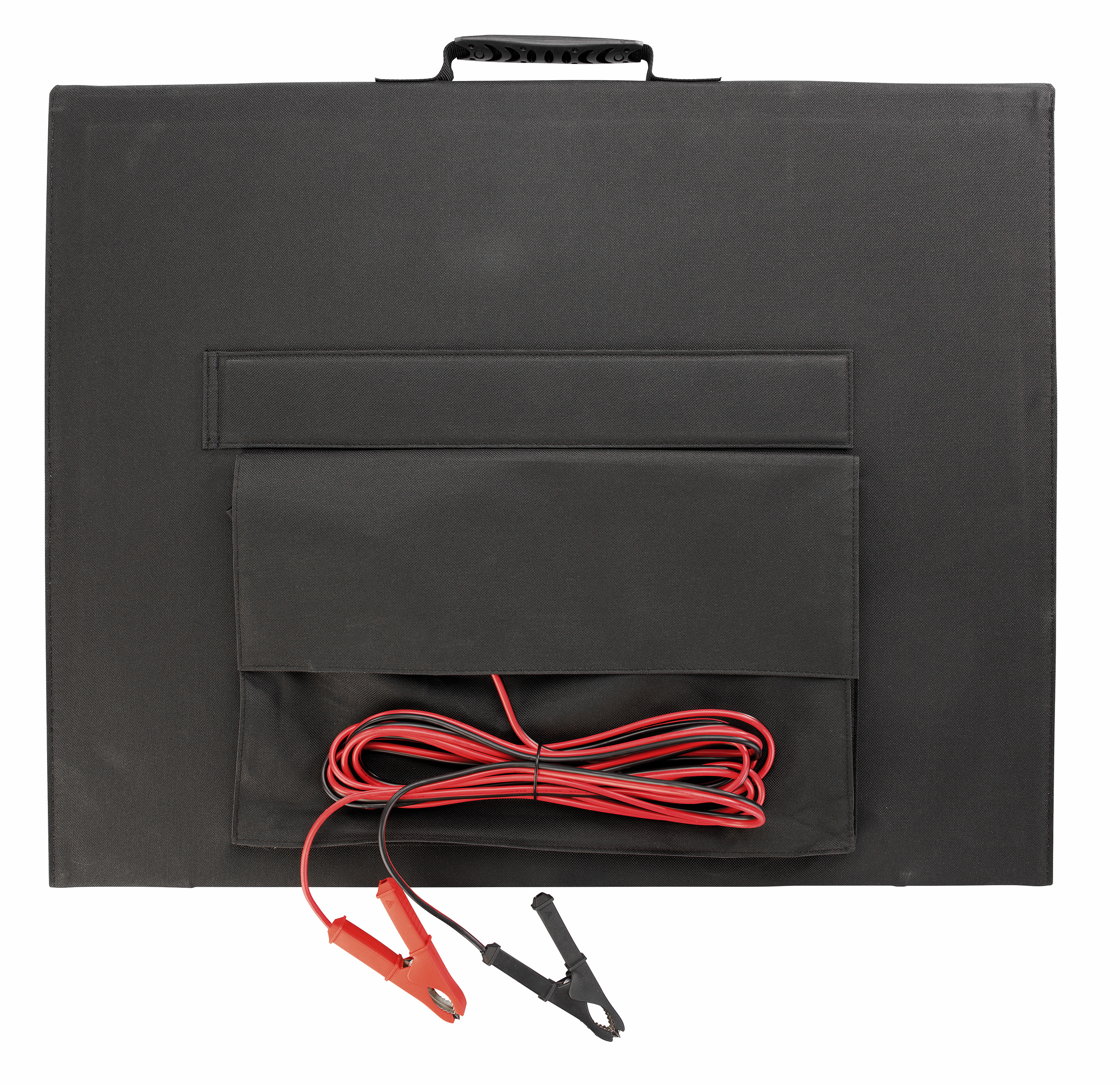 Leicht zu transportieren: Das Panel besteht aus 4 riesigen Solarzellen, die auf der Innenseite einer Tasche angebracht sind. Dadurch faltet man das Panel bequem zusammen. In der Größe einer Aktentasche ist es ideal zum Mitnehmen. In einer kleinen Außentasche findet das Anschlusskabel Platz.