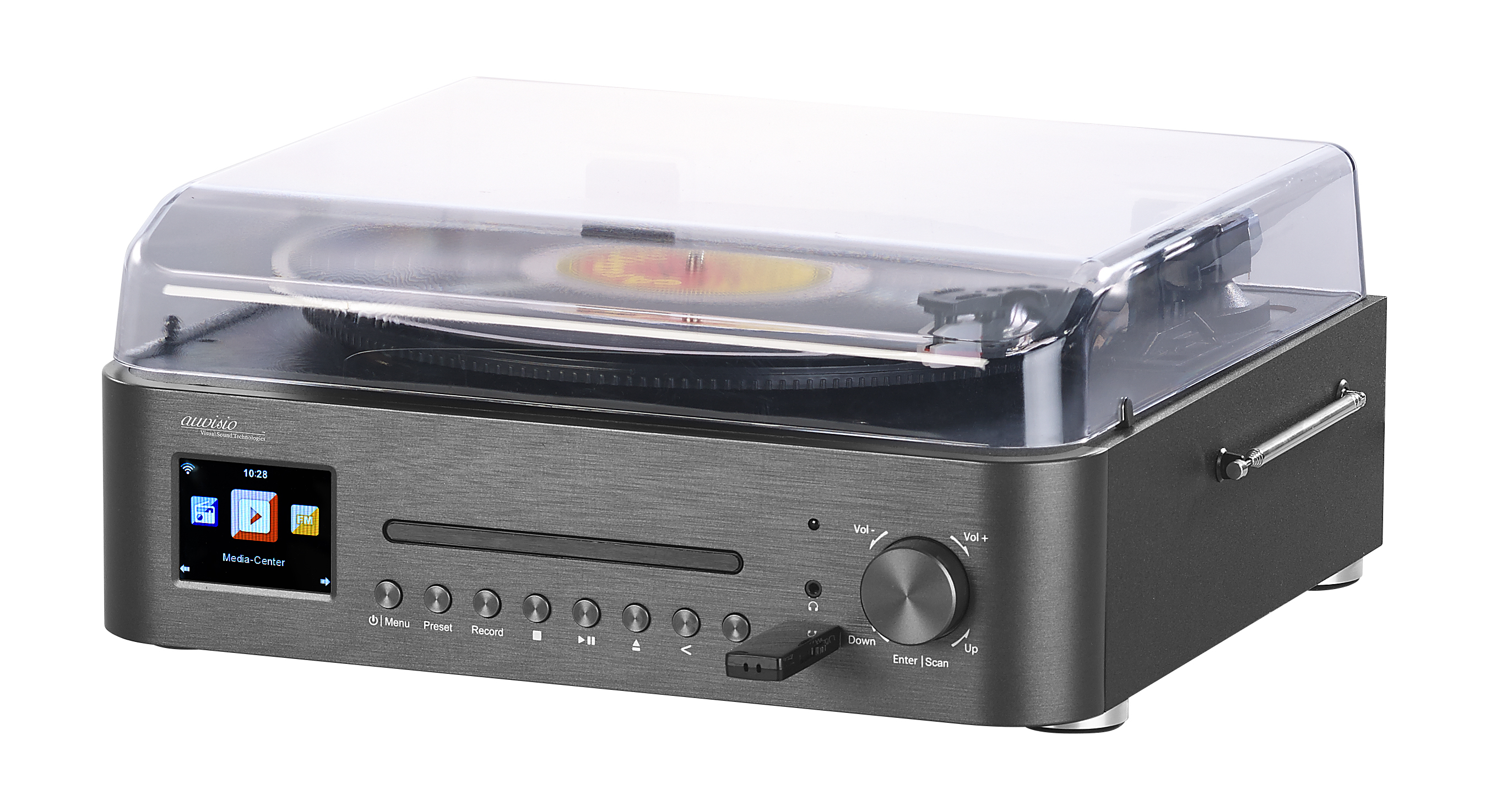Einmal Musikgenuss komplett, bitte: Jetzt hört man mit dem Multitalent von auvisio seine Lieblings-Musik von so gut wie jedem Medium - von Schallplatte, CD, Digitalradio, USB-Stick, dem Smartphone und mehr!