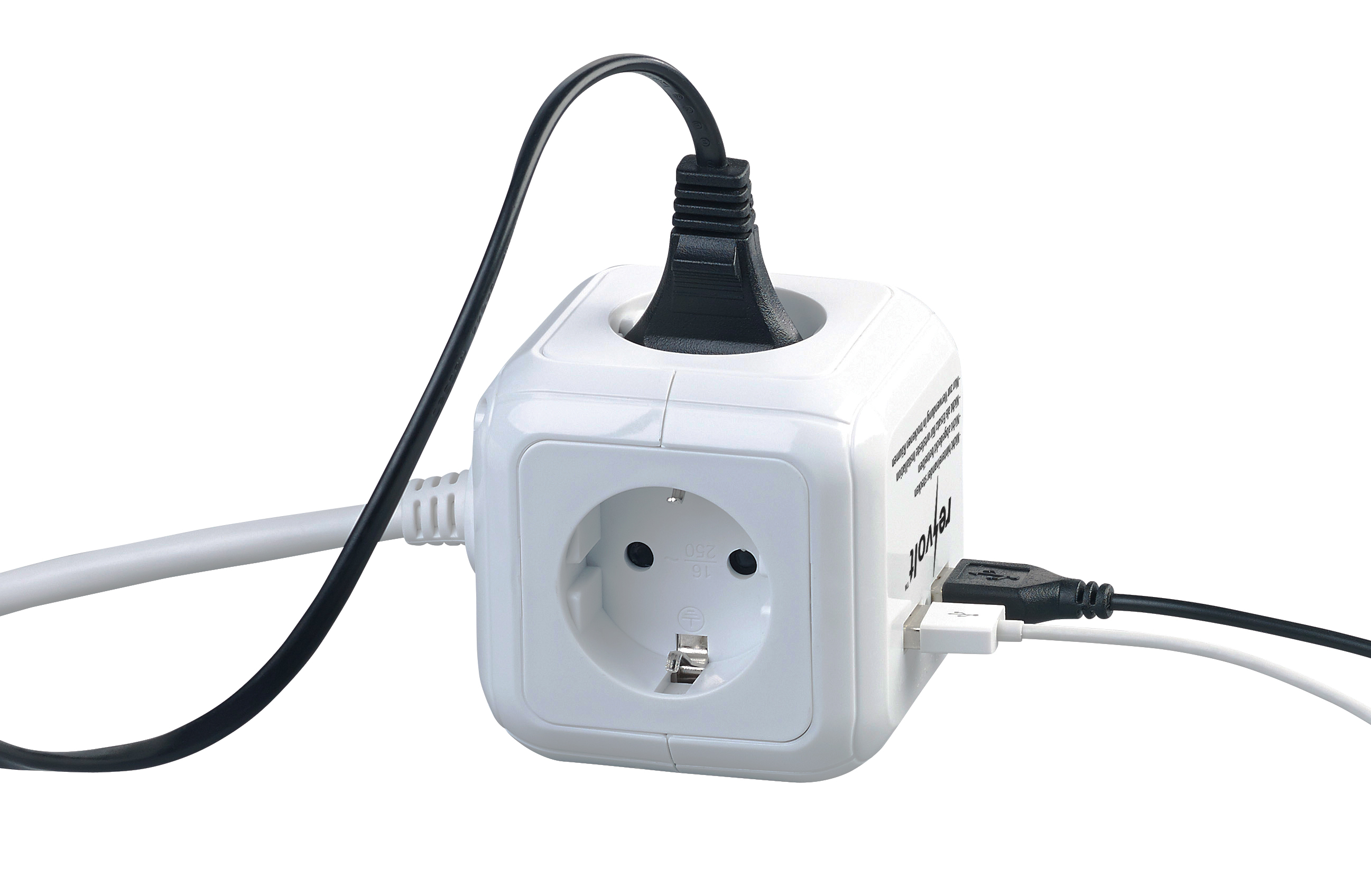 Viele Anschlüsse auf kleinstem Raum: Mit dem cleveren Steckdosen-Würfel von revolt verzichtet man auf im Raum liegende Steckdosen-Leisten. So spart man viel Platz.