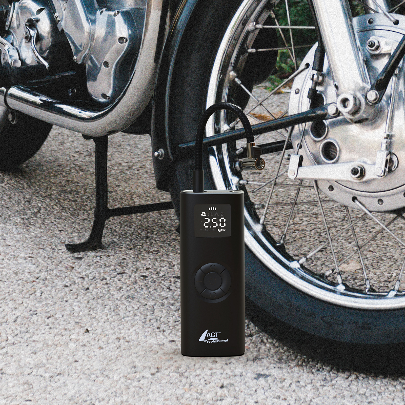 (lifepr) (Buggingen, 10.02.2023) Die ultrakompakte Akku-Kompressor-Luftpumpe ALP-155 von AGT Professional sorgt unterwegs immer für den richtigen Luftdruck bei Autos, Fahrrädern, Motorrädern, Bällen und Spielzeug, ohne eine Tankstelle anfahren zu müssen!