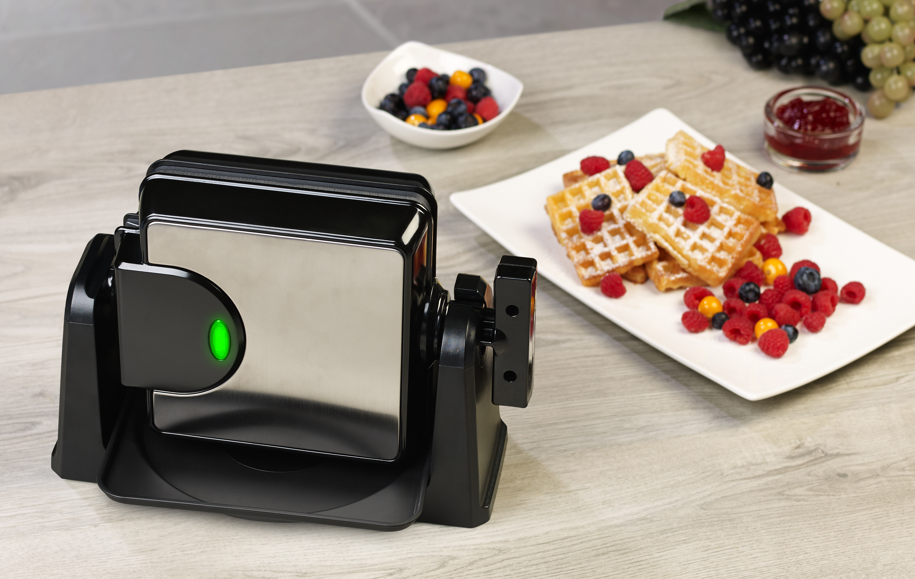 Über die stufenlose Temperaturregelung lässt sich die ideale Bräunung wählen. An der Antihaft-Beschichtung bleibt nichts kleben. Dank praktischer Backampel auf beiden Seiten weiß man immer, wann das Eisen einsatzbereit und die leckere Waffel fertig ist.