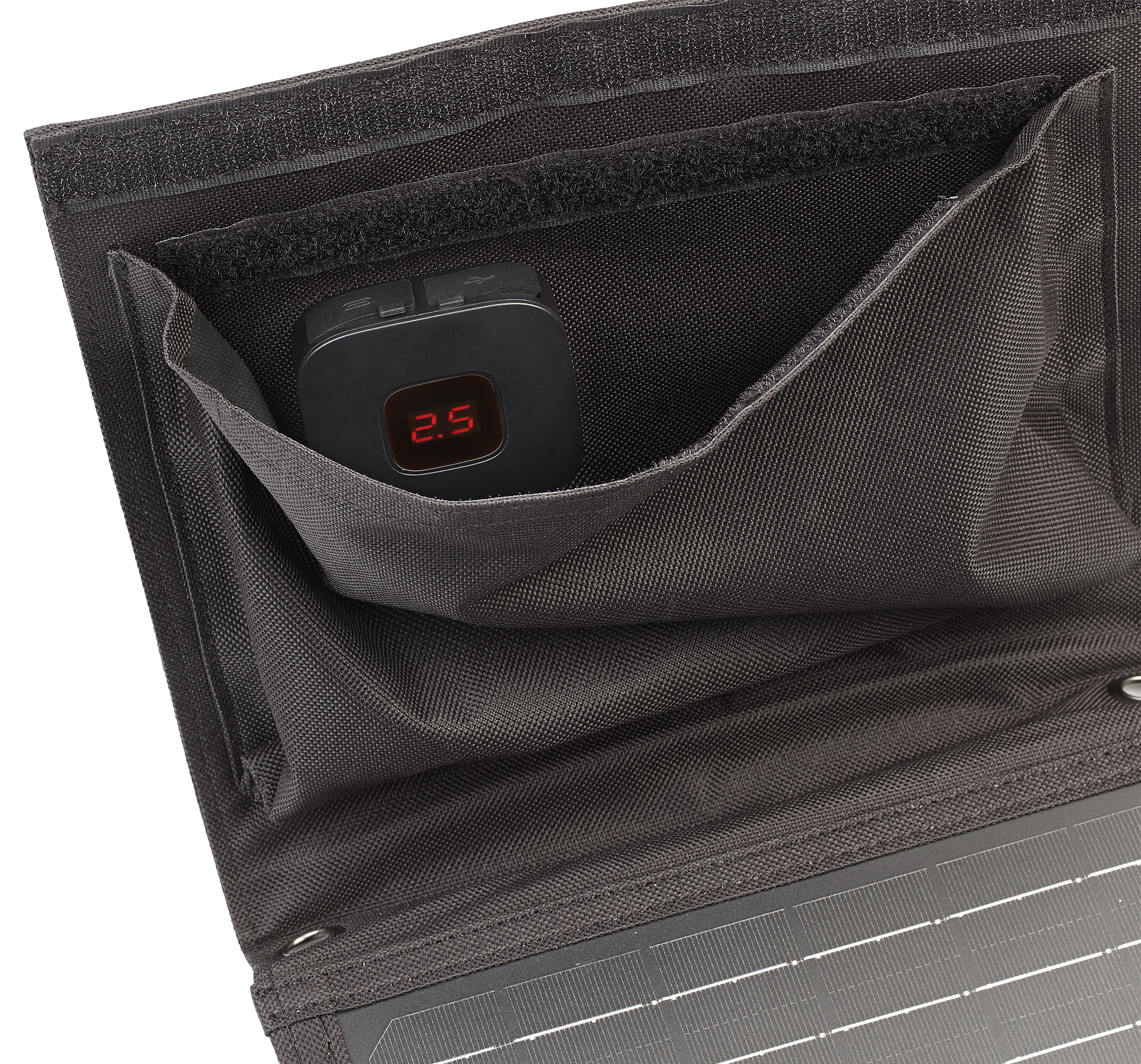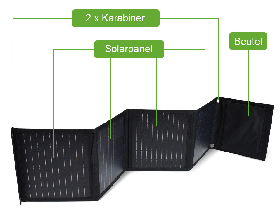 Flexibel befestigt: Dank 2 Karabinerhaken und Ösen an den Ecken bringt man das faltbare Solarpanel von revolt bequem an Wanderrucksack, Wohnmobil, Gartenhütte und mehr an.