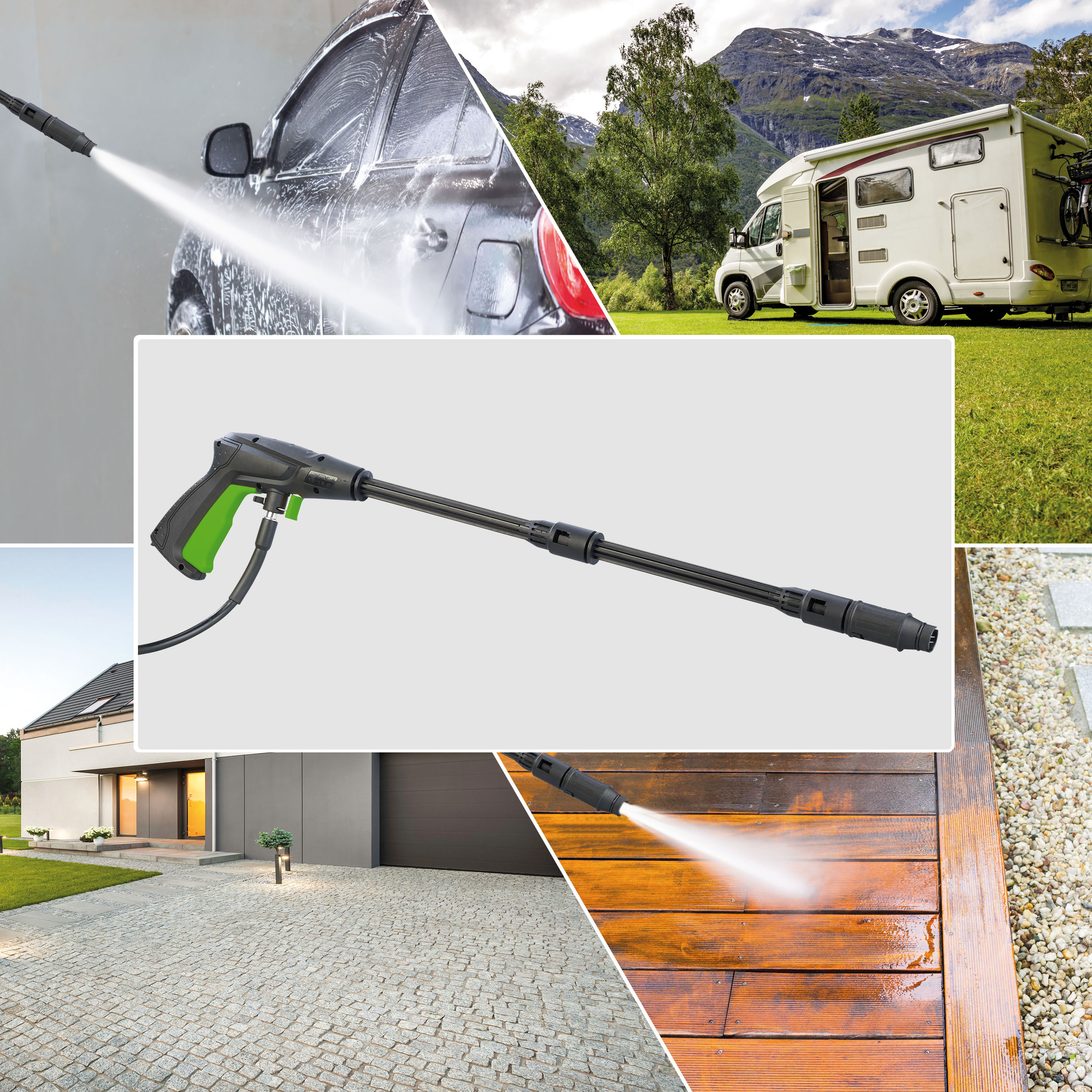 Besonders praktisch: Der Hochdruckreiniger eignet sich nicht nur zum Reinigen von Terrassenfliesen, Gartenteich und Vorgarten, sondern dank Schaumdüse mit Reinigerflasche auch zum Säubern von Gartenmöbeln, Autofelgen u.v.m.
