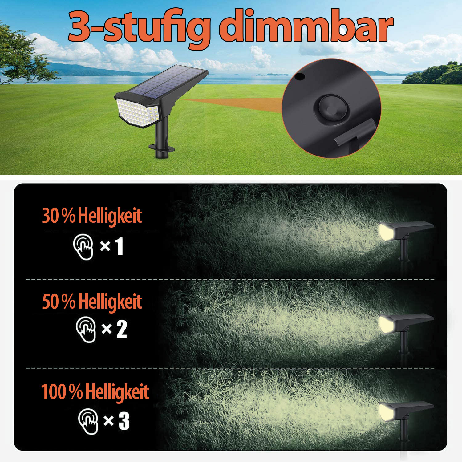 Sogar dimmbar: Per Taste auf der Unterseite lässt sich die Helligkeit der Strahler auf niedrig, mittel oder hoch einstellen. Oder man schaltet die Leuchte ganz aus, z.B. wenn man im Urlaub ist.