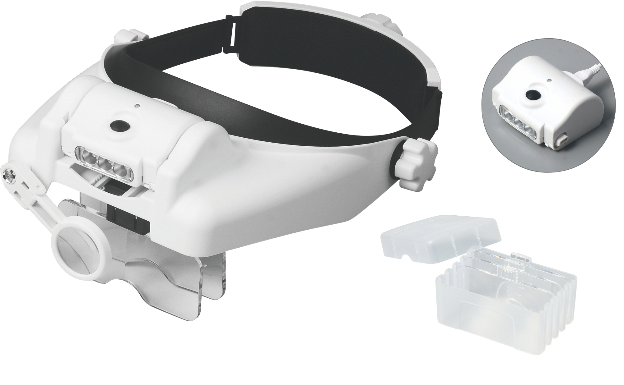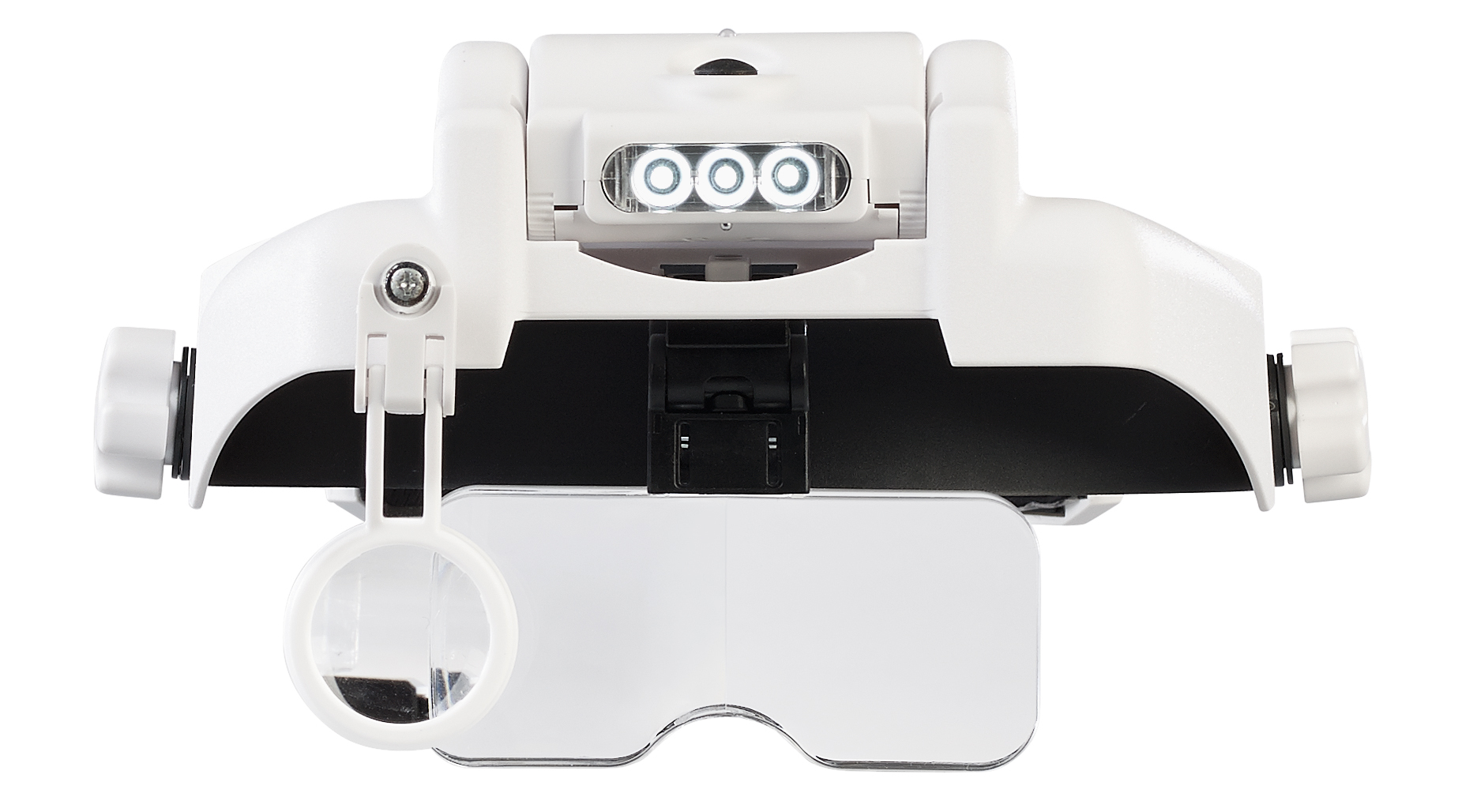 Auch kleinste Details ganz groß sehen: Man zieht das Stirnband über und klappt einfach die Vergrößerungslinsen herunter, die man benötiget. Es lassen sich auch mehrere Linsen für eine insgesamt bis zu 14-fache Vergrößerung kombinieren.
