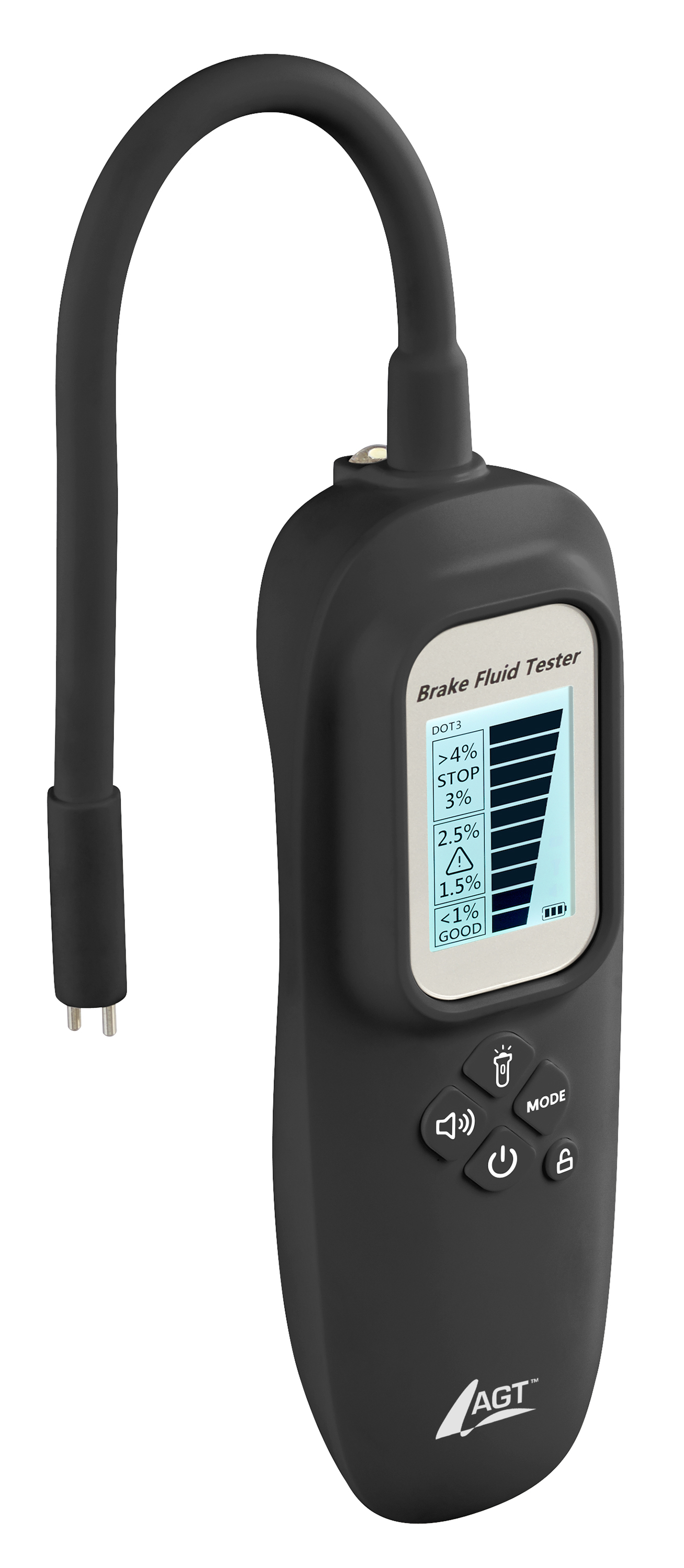 Die Sicherheit der Bremsen im Blick behalten: Enthält die Bremsflüssigkeit zu viel Wasser, wird der Bremsdruck nicht mehr richtig übertragen und die Bremsen versagen. Dank des Bremsflüssigkeits-Testers von AGT Professional überprüft man jetzt jederzeit selbst den Wasseranteil in der Bremsflüssigkeit. Zudem warnt ein Alarmton, wenn man neue Bremsflüssigkeit benötigt. So handelt man rechtzeitig und ist stets sicher unterwegs.