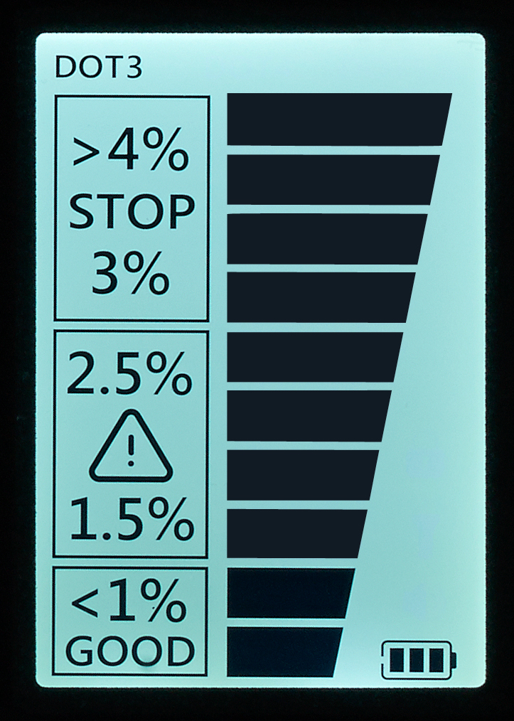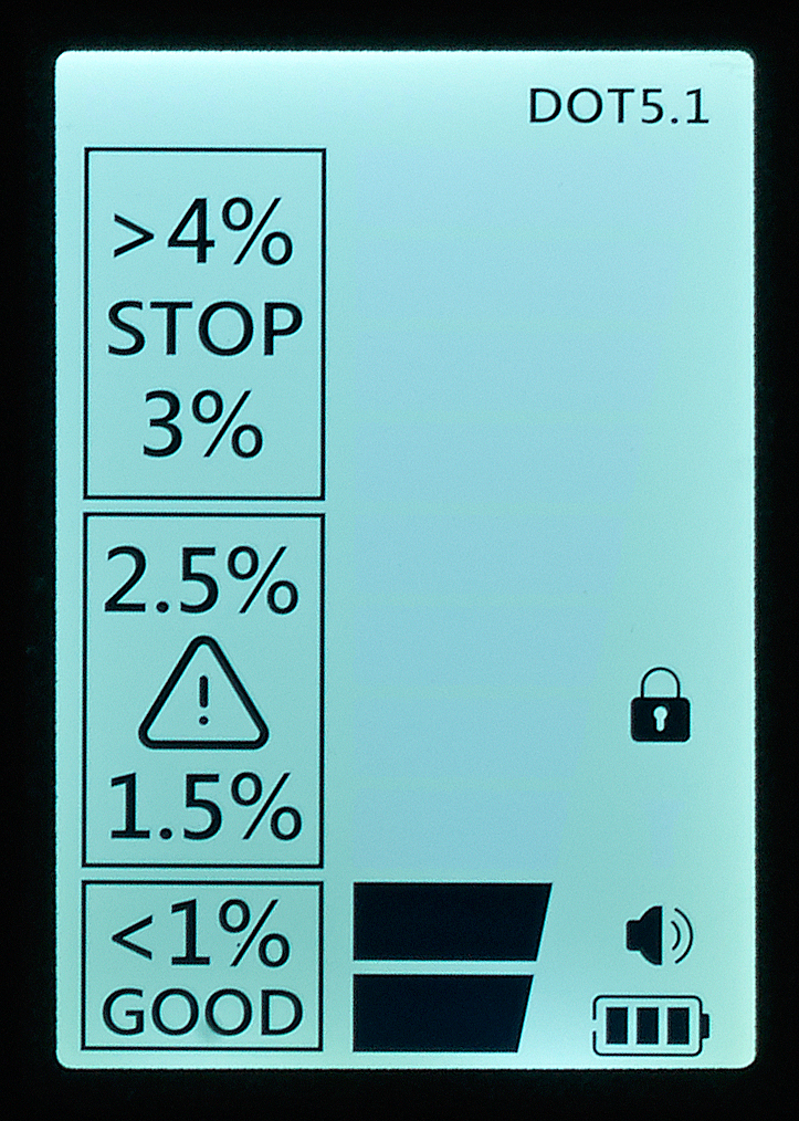 Kinderleichte Anwendung: Taucht man den Sensor des Testers einfach in die Bremsflüssigkeit, schon misst man den Wassergehalt und erhält den Prozentwert auf dem übersichtlichen LCD-Display. Der Wert lässt sich per Lock-Funktion speichern, um ihn bei der nächsten Messung sofort zur Hand zu haben.