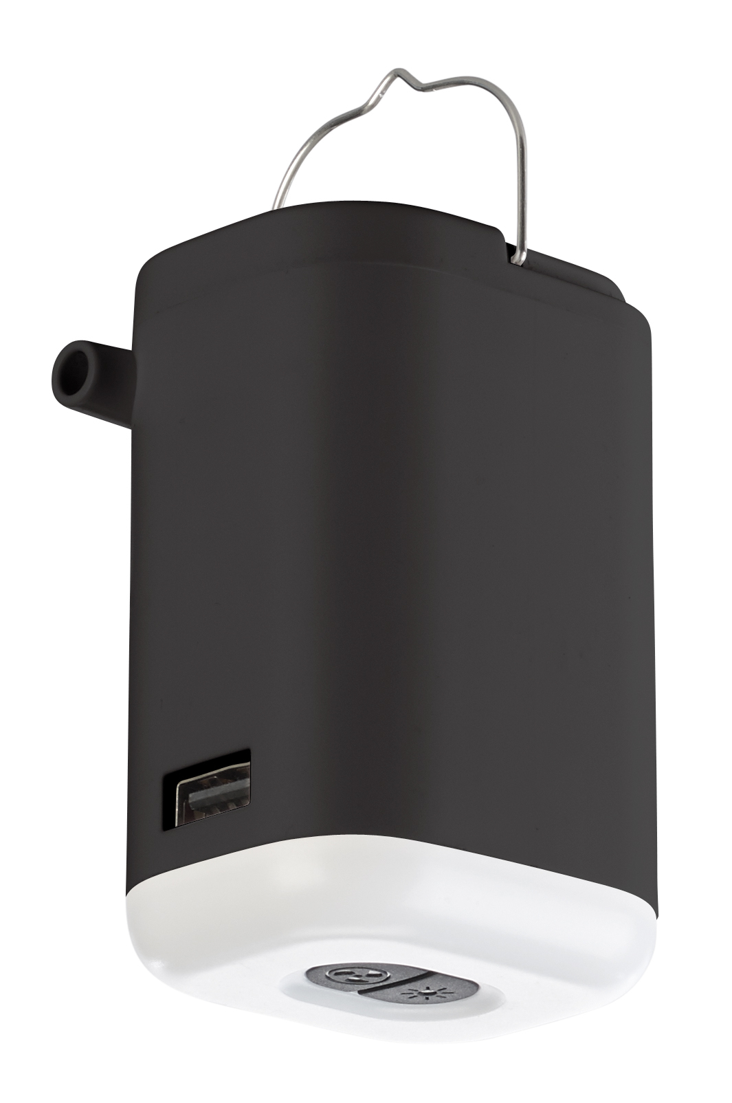 Spendet auch Licht: Die Luftpumpe lässt sich auch als praktische Campingleuchte nutzen. Einfach mit dem integrierten Haken z.B. im Zelt aufhängen. Mit 3 Helligkeitsstufen hat man immer die passende Beleuchtung.