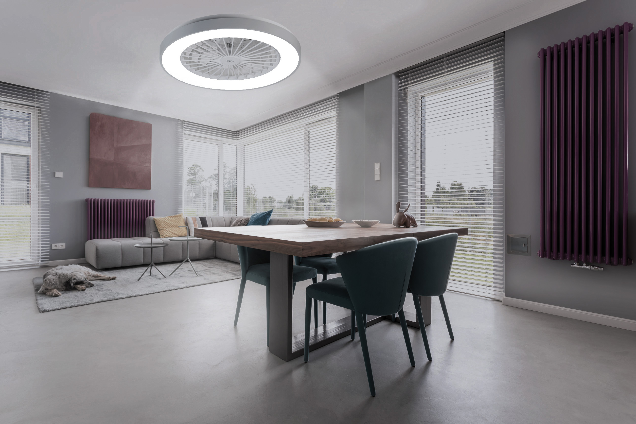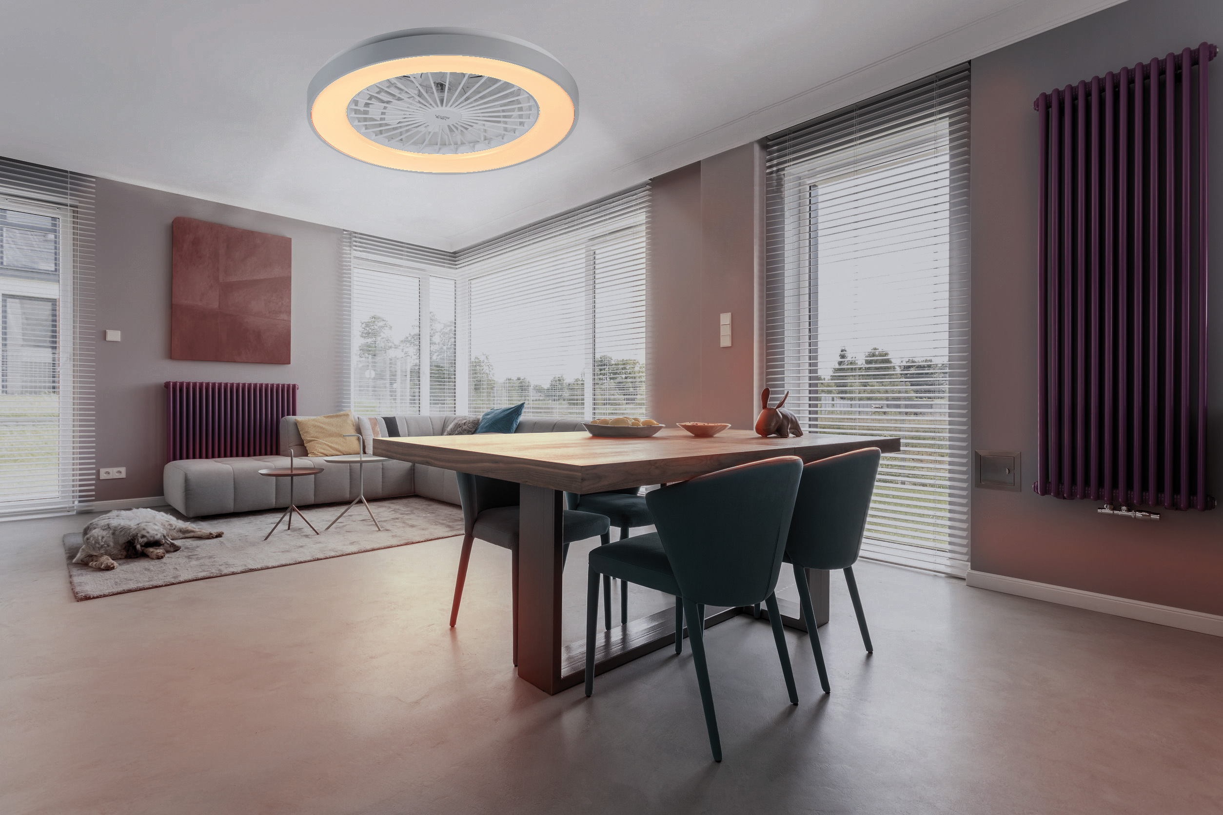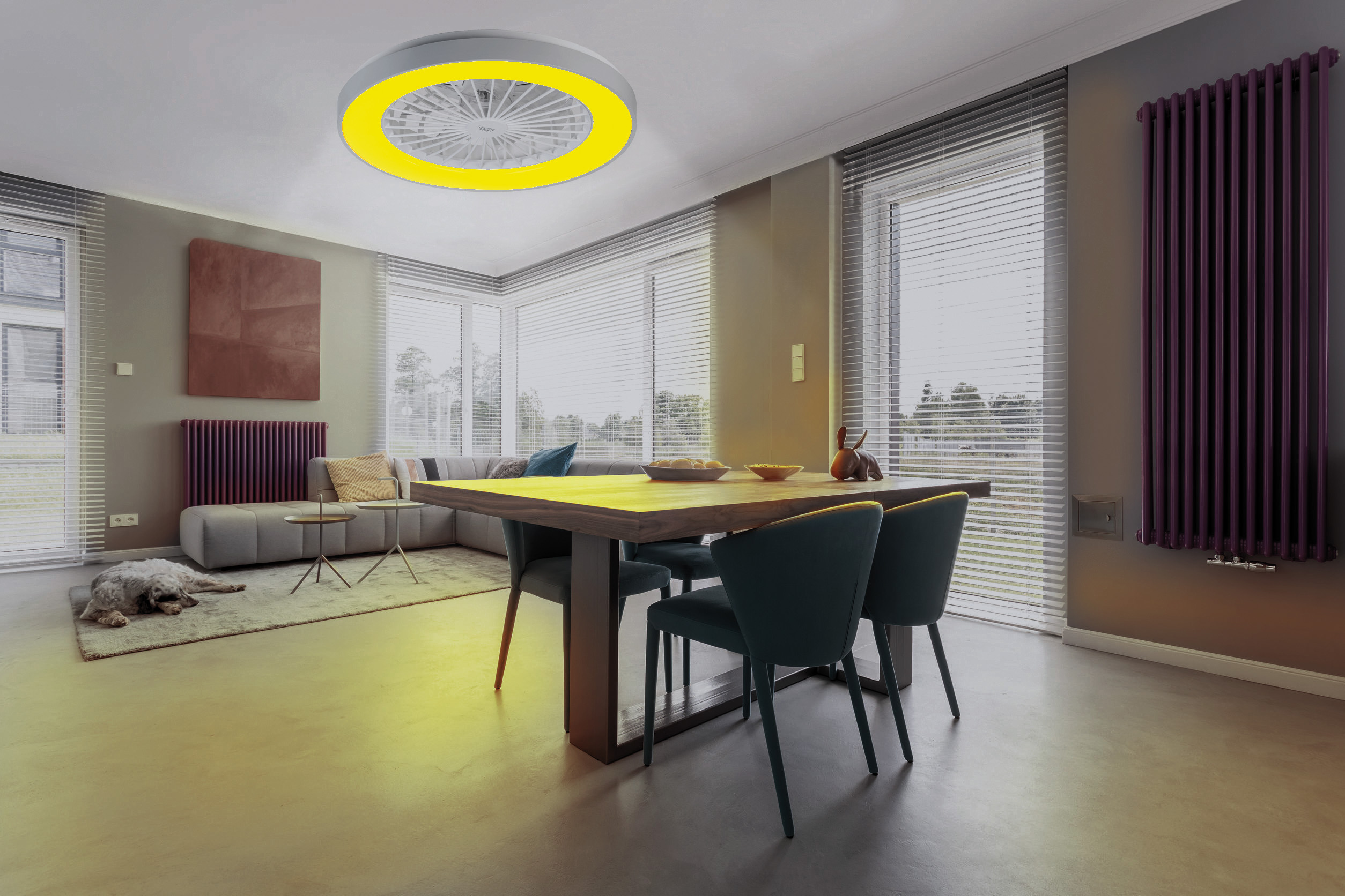 (lifepr) (Buggingen, 28.06.2023) Die 2in1-WLAN-Deckenleuchte & Ventilator VT-900.led von Sichler Haushaltsgeräte leuchtet in warmweiß, tageslichtweiß und 16 Millionen Farben und sorgt mit dem separat schaltbaren Ventilator für eine frische Brise. Die Steuerung erfolgt per Sprachbefehl, Fernbedienung oder kostenloser App „ELESION“.