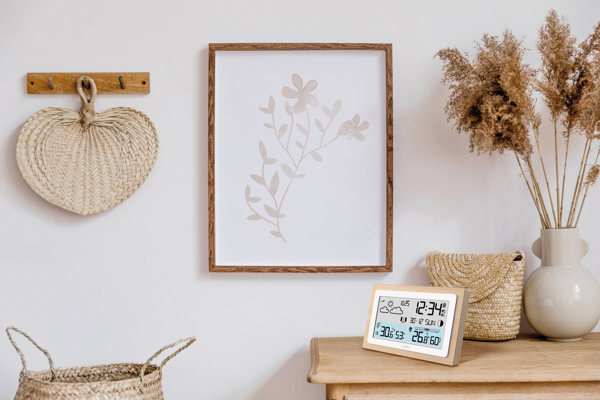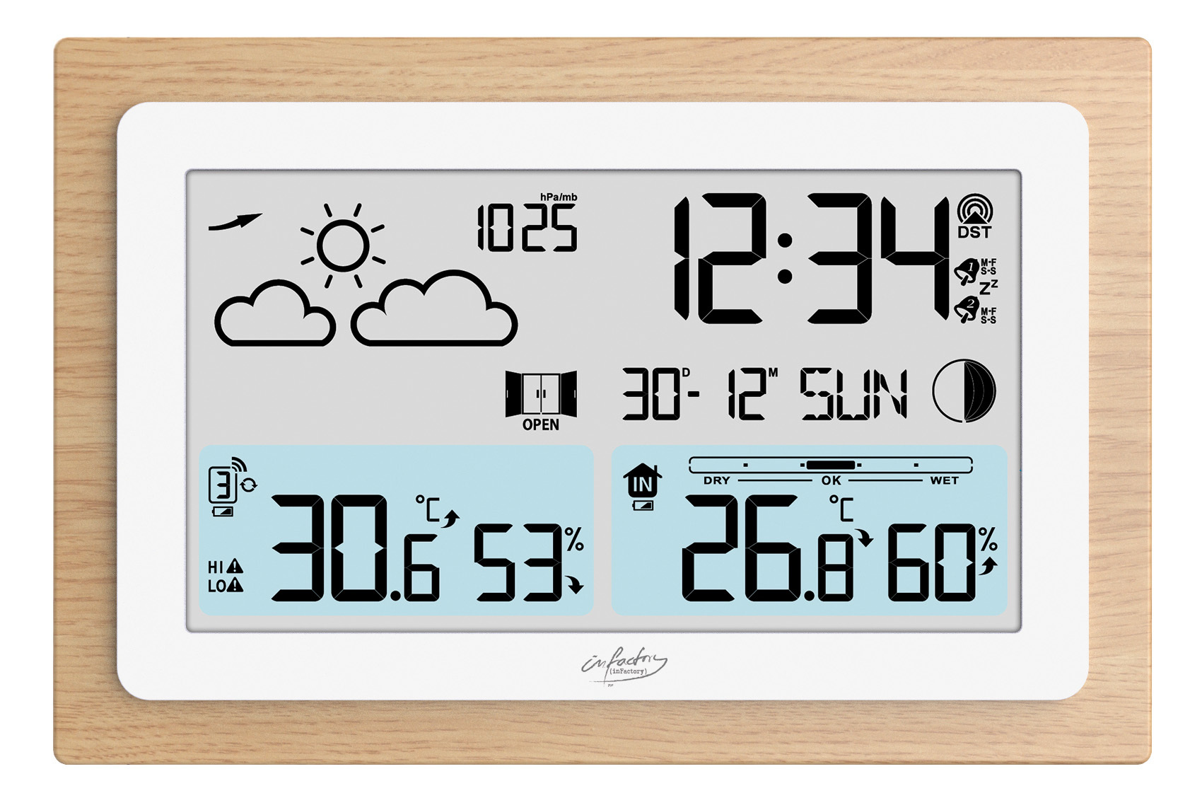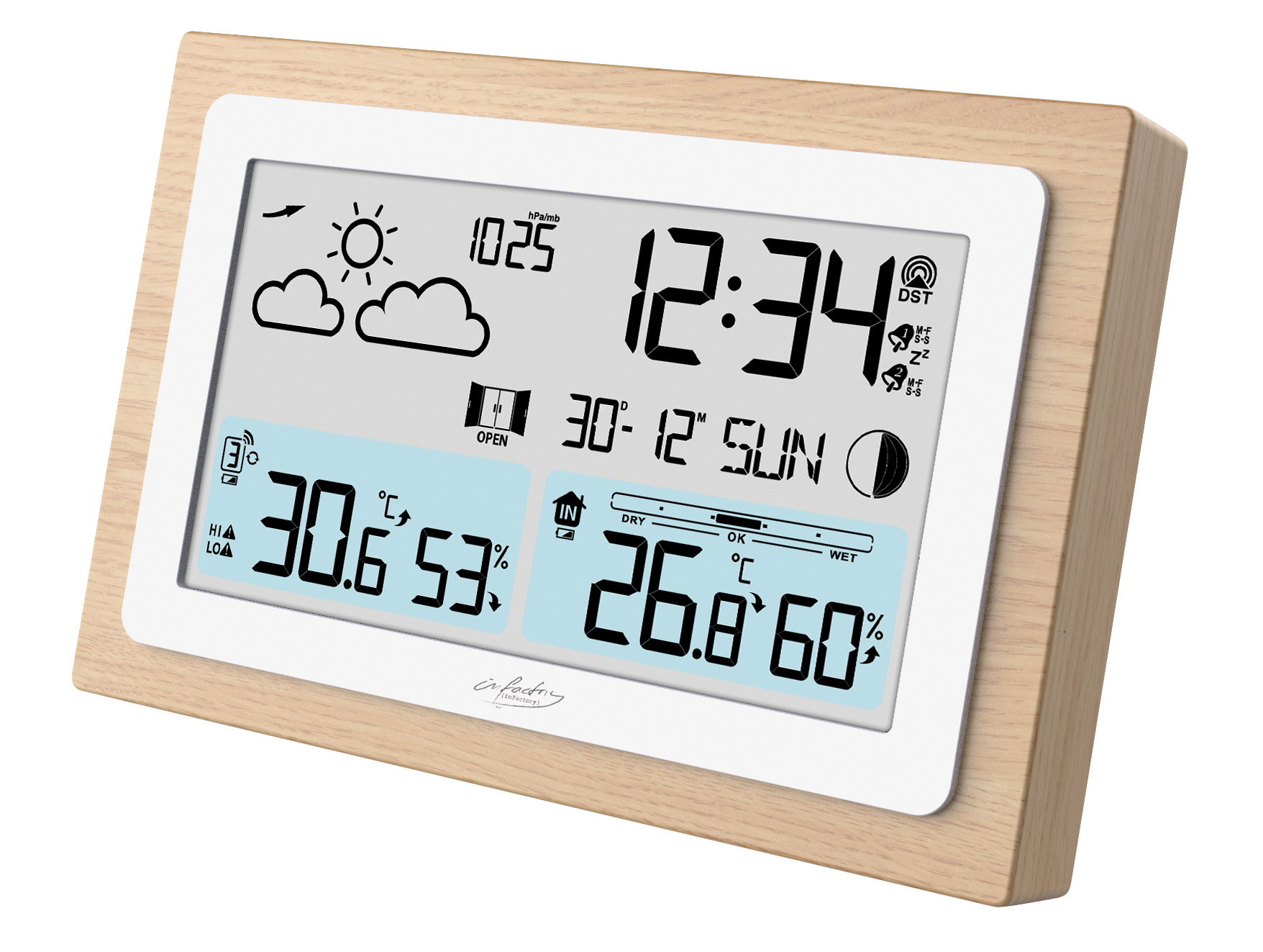 (lifepr) (Buggingen, 01.12.2023) Die Funk-Wetterstation FWS-100 im Echtholz-Rahmen von infactory vereint zeitloses Design mit moderner Technik. Der hochwertige Rahmen fügt sich elegant in jeden Raum ein und macht die Wetterstation zu einem dekorativen Element. Mit präzisen Wettervorhersagen, Uhr- und Weckerfunktion sowie einem benutzerfreundlichen Display bietet sie vielseitige Funktionen für den Alltag. Die automatische Funkzeitaktualisierung sorgt für präzise Zeitangaben, während das gut ablesbare Display alle relevanten Informationen wie Wettertrend, Mondphase und Barometer übersichtlich darstellt.