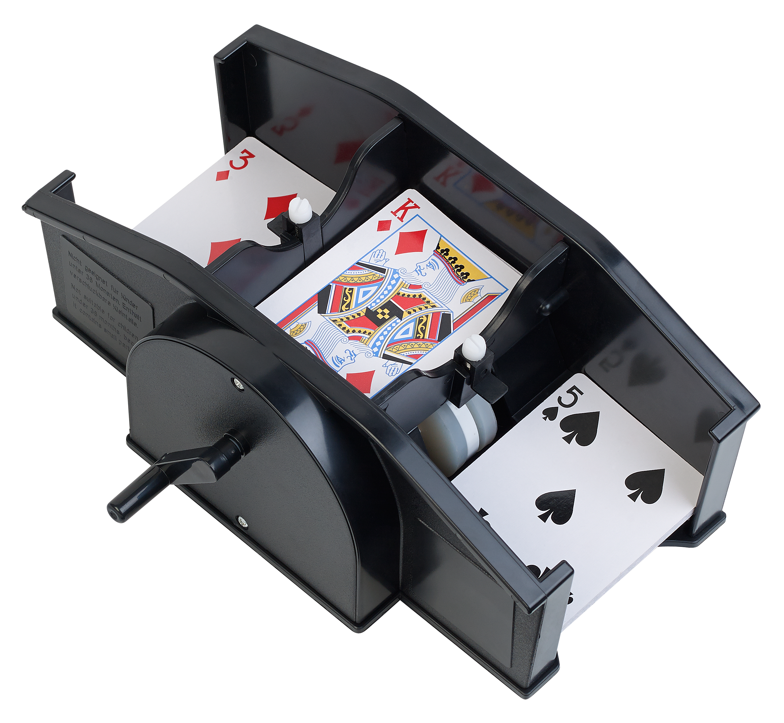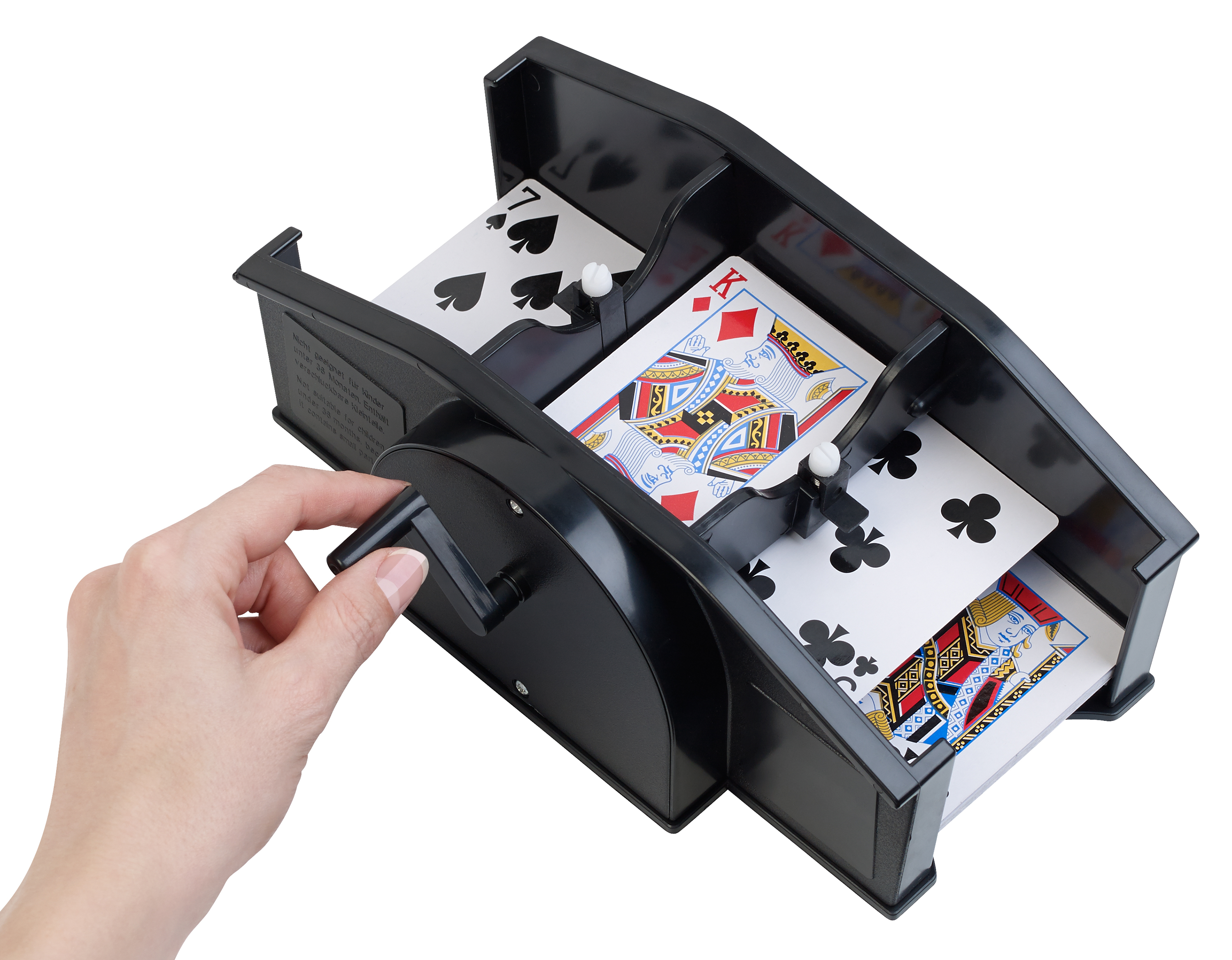 Karten mischen wie ein Profi: Einfach die Karten in die Ablage der Kartenmisch-Maschine von Grand Straight Royale legen und an der Kurbel drehen. Schon fallen die Karten willkürlich in die beiden Auffangbehälter. Dann den Stapel herausnehmen und die nächste Spielrunde starten.