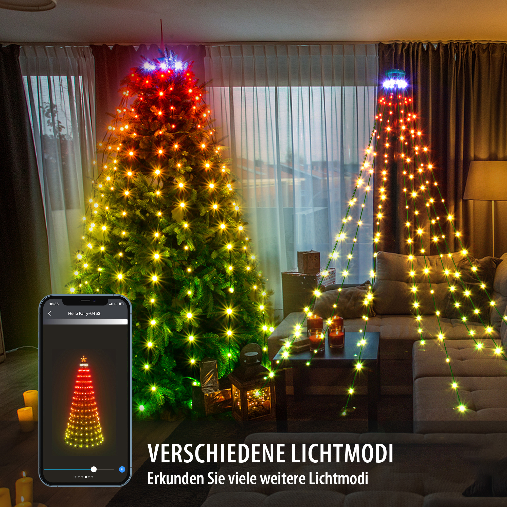 Moderne RGB-IC-Technologie: Jede einzelne Girlande kann mehrere Farben gleichzeitig darstellen. 6 unterschiedliche Licht-Modi schaffen spektakuläre Effekte und machen die bunte Beleuchtung zum absoluten Highlight. Bei Bedarf kann man auch ganz einfach sein eigenes Licht-Programm erstellen.